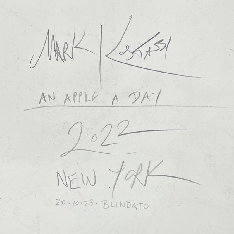 "An Apple a Day" is an original drawing on paper by Mark Kostabi, hand signed by the artist. This piece comes custom framed and includes a certificate of authenticity. Measures approximately 17" x 14" (frame), 11" x 8" (image).