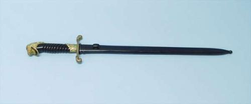 An Argentine Air Force officer's dagger. Handle is carved ebony wood in gilt bronze with lion head casing. Scabbard is black patinated metal. 21 1/2" long. 300-500