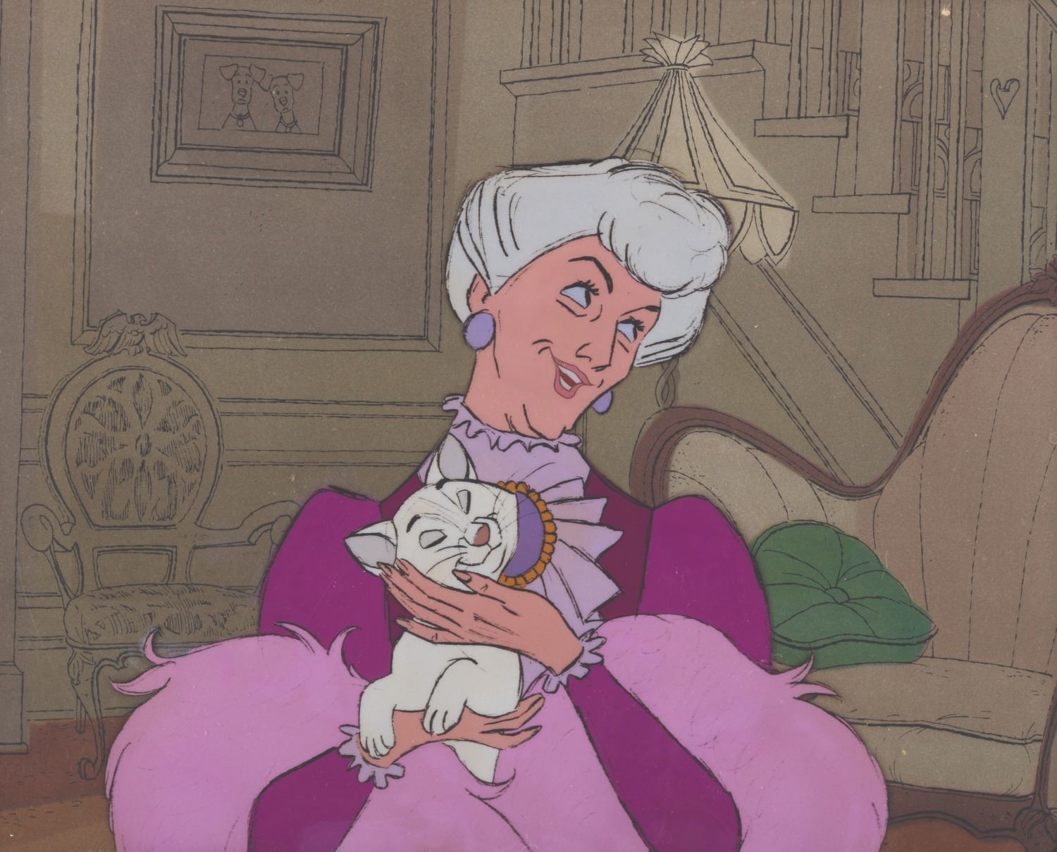 (Disney, 1970) An original production cel of the Madame Bonfamille and Duchess from "The Aristocats." This cel was originally prepared and sold at the Art Corner in Disneyland, trimmed and attached to a color copy background, with the Art Corner gold label still on the reverse. Madame Bonfamille and Duchess have an image size of 6.25" x 7" on an 8" x 10" visible cel. The entire matted piece measures 12" x 14". The piece is in good condition with spots of paint loss, scratches, light warping, and wear and discoloration from age to the matte, with a hole at the top from display.