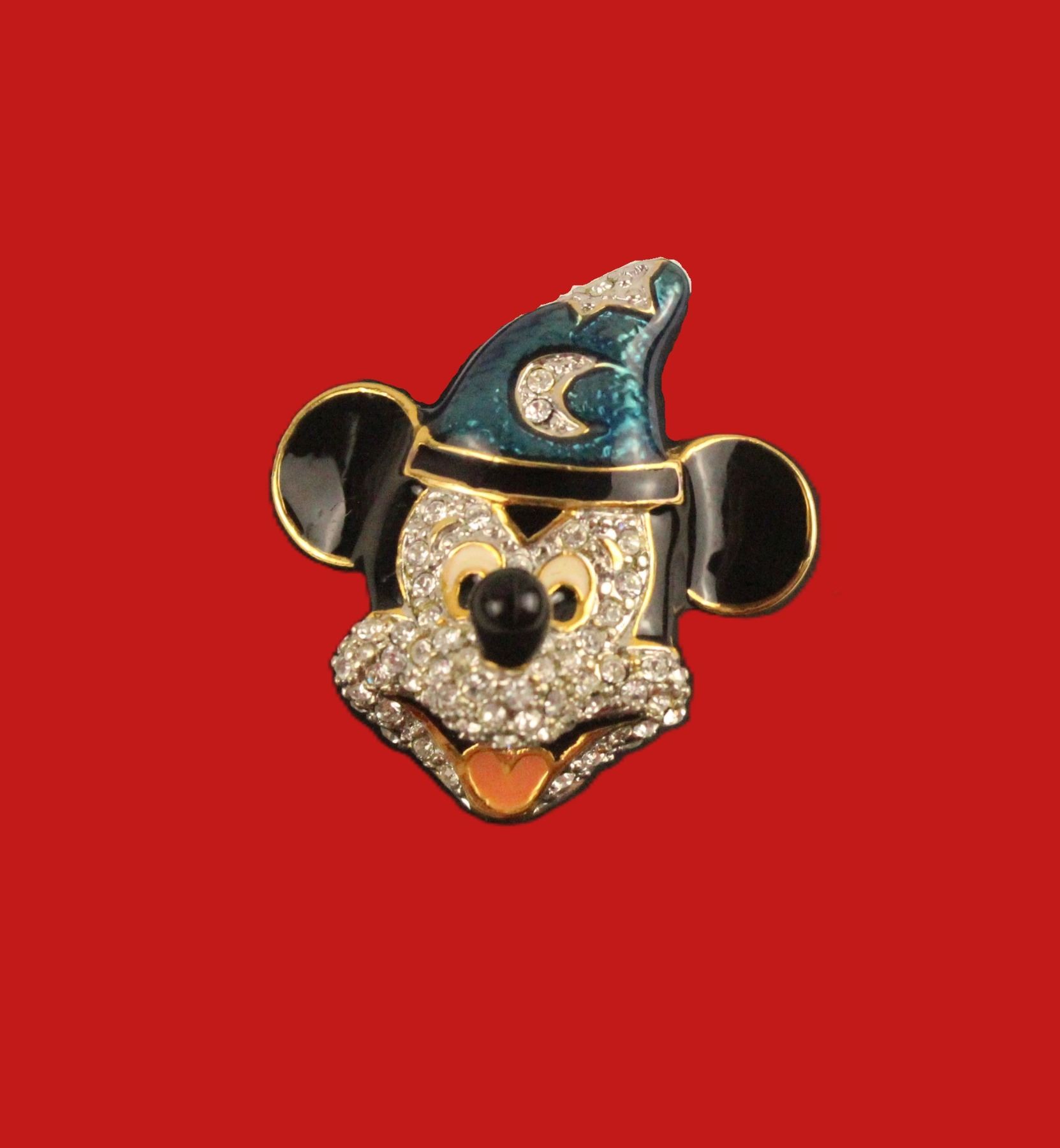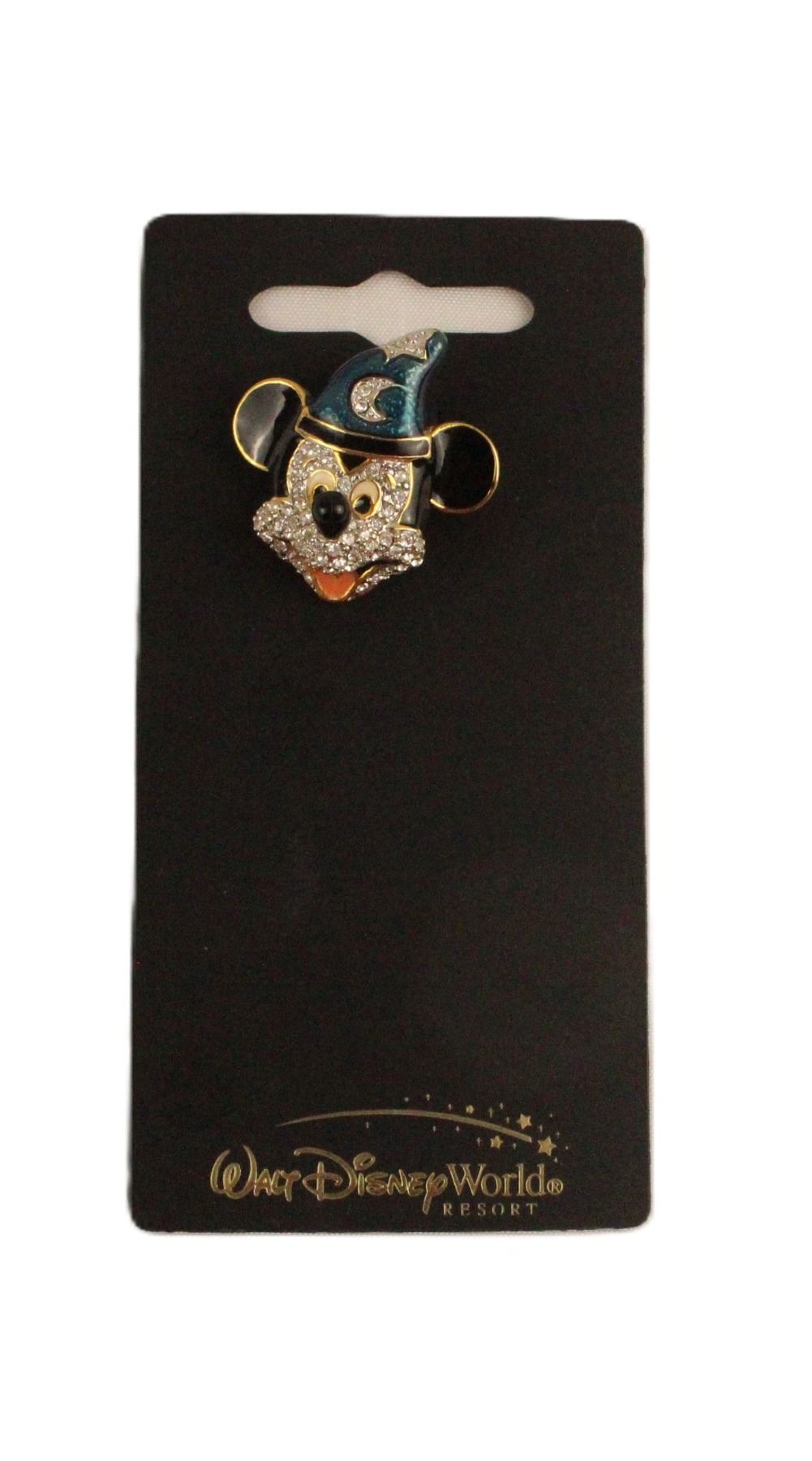 This brooch is a Sorcerer Mickey Head by Arribas Brothers It features white Swarovski crystals and marbled paint. It measures 1.25”. It is in new condition on its original purchase card.