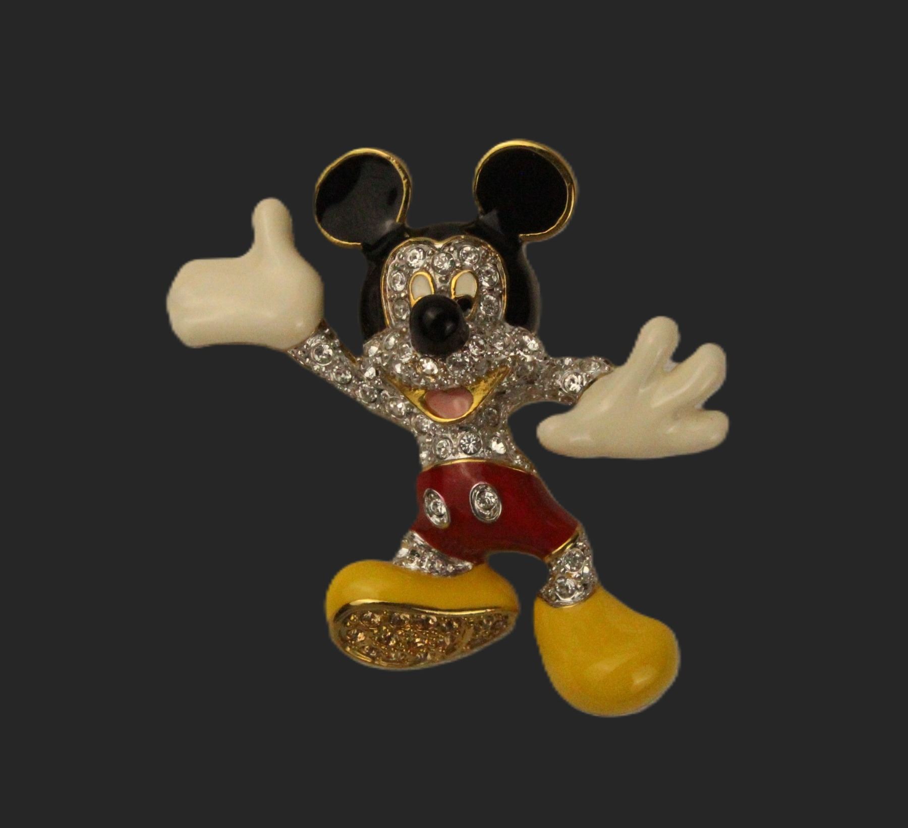 (Disney, 2005) This is a beautiful Disney Arribas Brothers Swarovski Mickey Mouse Pin set with Pave Crystals and highlighted with Black, Red, White and Yellow Enamel. It measures 1.75" x 1.5" and is stamped with the Arribas Brothers Symbol, your assurance of Authenticity and Excellence. It is is in mint condition.