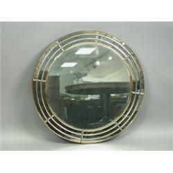 An Art Deco circular wall mirror, the central mirror surrounded with three rows of pale pink and blue glass sections. 76.5cm diameter