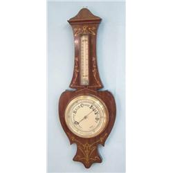 An Art Nouveau inlaid mahogany aneroid barometer with silvered barometer and thermometer dials, 2ft 10ins £250-350
