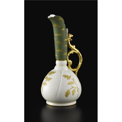 <B>A French Art Porcelain Ewer</B></I><BR><BR>Unknown maker, Limoges, France<BR>Circa 1890-1900<BR>Porcelain with enamel and gilt decoration<BR>Marks: In green: vase above <I>LIMOGES</B></I>; in gold: <I>A Jen King</B></I>; Impressed <I>114 / 1</B></I><BR>10 inches high x 4.5 inches diameter x 4.25 inches wide<BR><BR>The pear-shaped lobed body with gilt oriental branch extending into narrow neck with flared step cut lip with mat green glaze and stylized gilt colored decoration; gilt loop and scroll handle terminating in lion's head.<BR><BR> <B>Condition Report:</B> minor wear to gilt decoration<BR><BR><b>Shipping:</b> Requires 3rd Party Shipping (<a target="_blank" href="http://www.heritageauctions.com/common/shipping.php">view shipping information</a>)