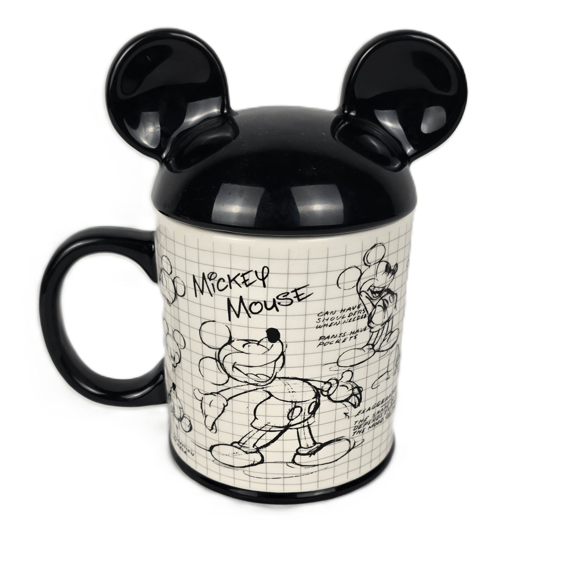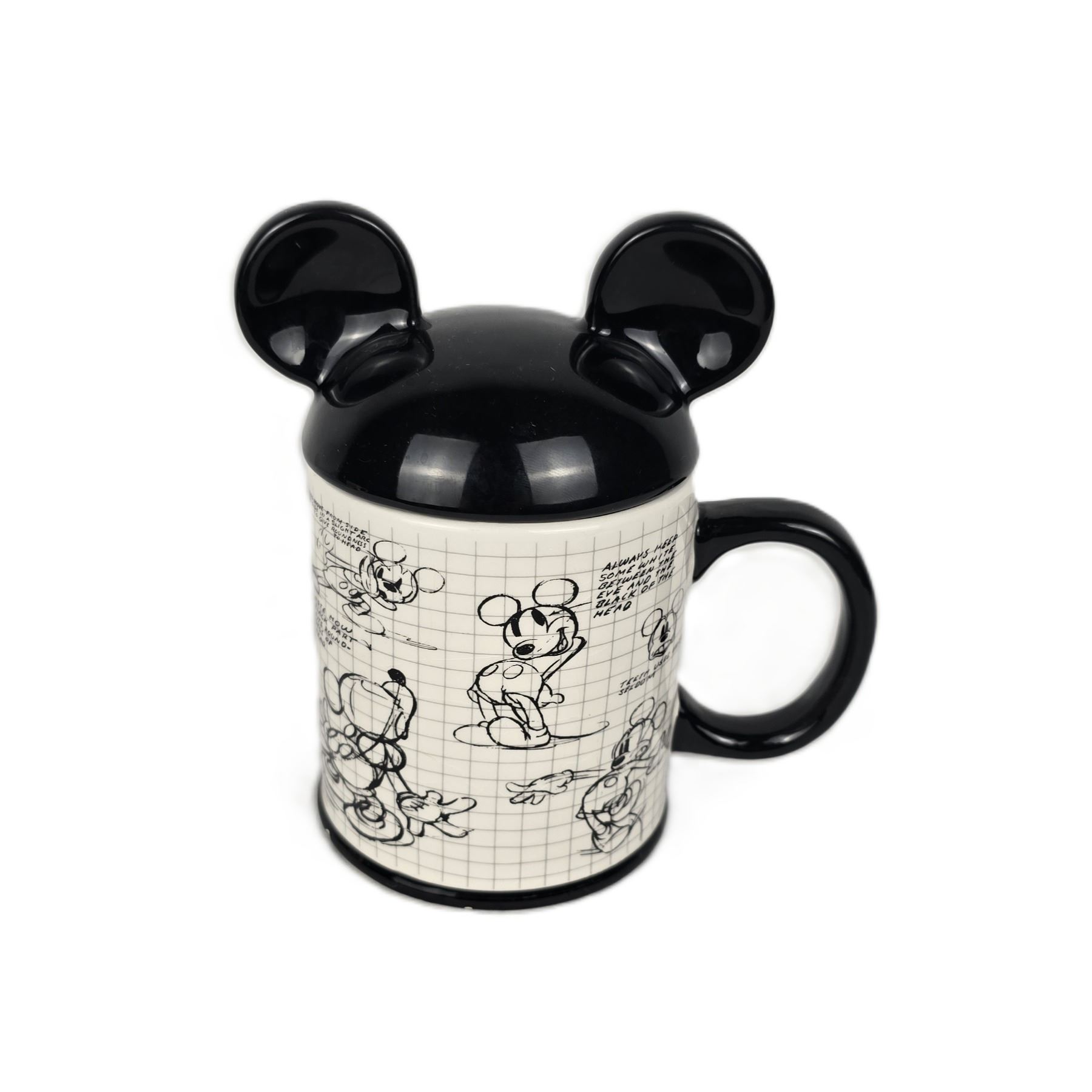 This is a 4” tall mug featuring many versions of Mickey Mouse in the state of being drawn by an artist. The mug includes a black Mickey ear lid to keep beverages warm. It does show crazing. It weighs 1 lb.