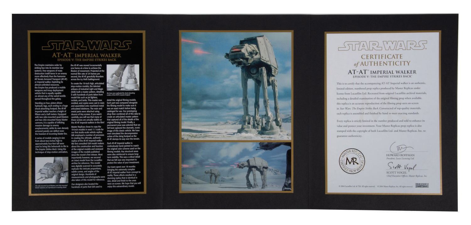 (Master Replicas, 2006) An Artist Proof of the Star Wars Imperial Walker model by Master Replicas. The All Terrain Armored Transport is a replica of the production used models from "The Empire Strikes Back." This is one of few unnumbered pieces produced outside the regular edition of 1000 pieces. The AT-AT measures 18.75"x22"x8.75" inside a 21.25"x11"x27" display case and is in very fine condition.