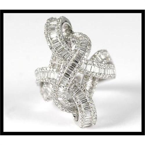 This fun 18K white gold diamond ring contains 133 tapered baguette diamonds weighing approximately 1.79 carats total weight and 242 round diamonds weighing approximately 1.31 carats total weight. The ring weights 11.0 grams.