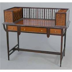An Arts and Crafts style walnut and rosewood writing table, with bobbin spindle rail back and open stationery compartments over three drawers on square tapered legs with cross stretchers 4ft £500-700