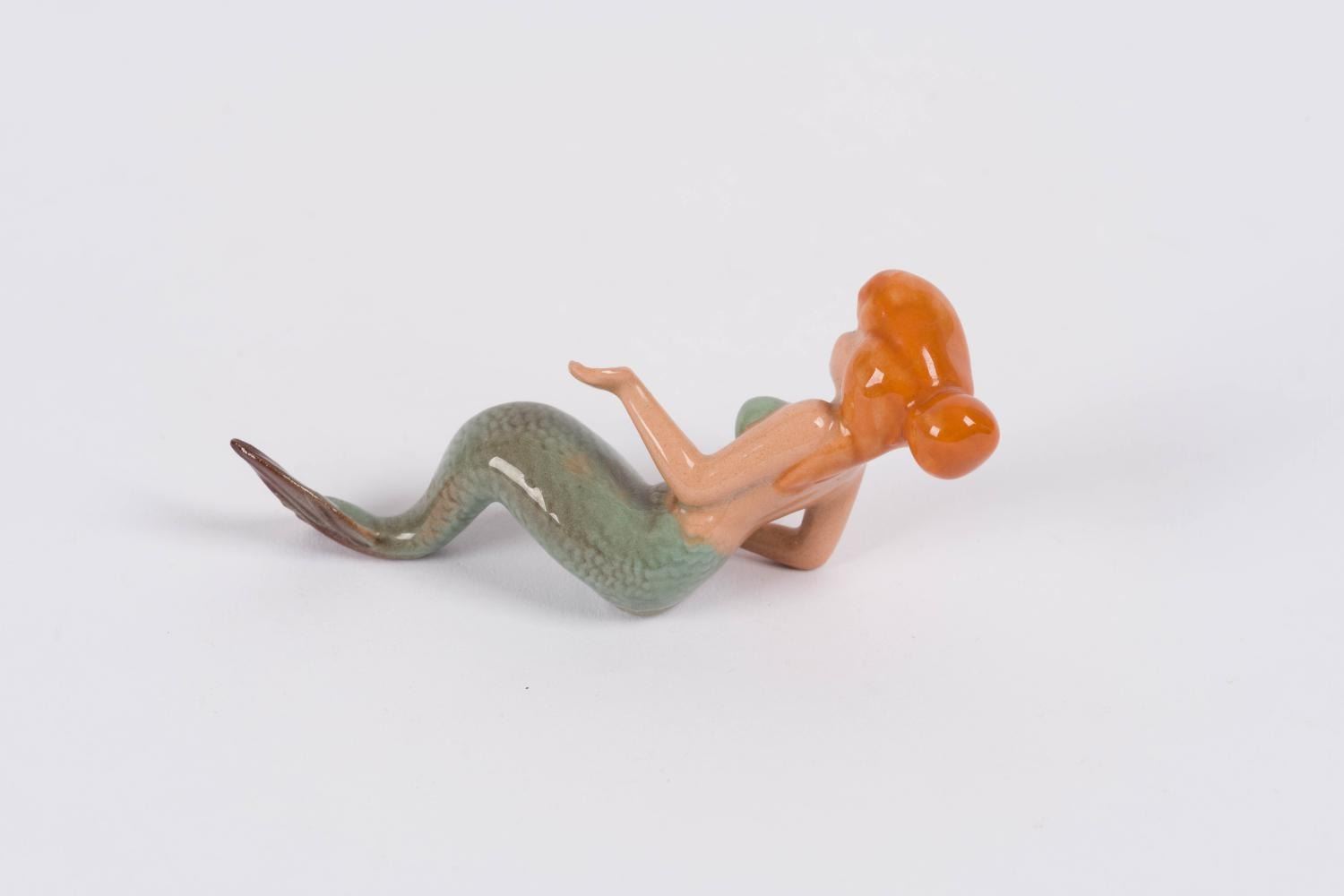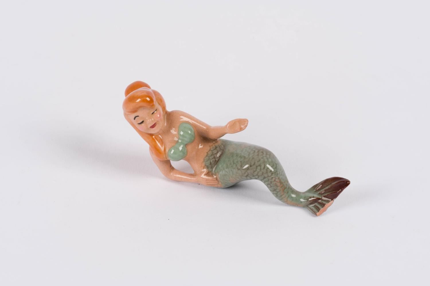 (Hagen-Renaker, 1950s) An As-is figurine of a mermaid from"Peter Pan" by renowned Californian ceramist, Hagen Renaker. Measuring 3" x 0.75" and 1.25" tall, the figurine is in fair condition with a broken fin and visible crazing.