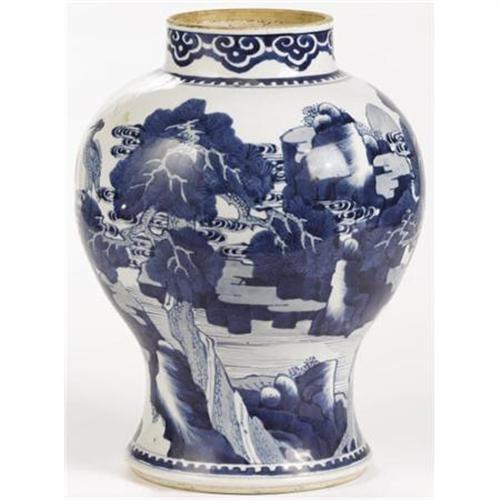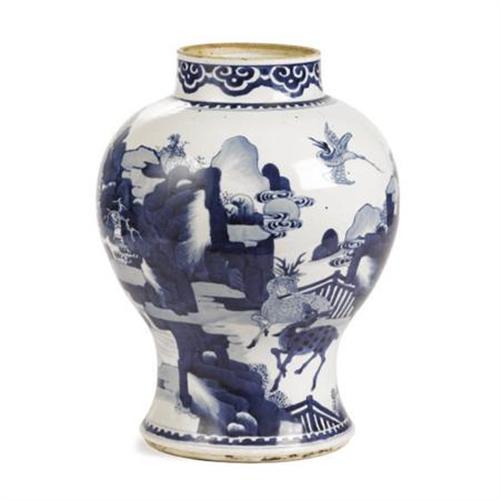<B>An Asian Ceramic Vase</B></I><BR>Unknown maker<BR>Twentieth Century<BR>The baluster form depicts a blue landscape with deer and crane<BR>Unmarked<BR>13 inches high x 9.5 inches diameter<BR><BR><b>Shipping:</b> Requires 3rd Party Shipping (<a target="_blank" href="http://www.heritageauctions.com/common/shipping.php">view shipping information</a>)