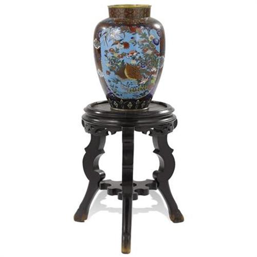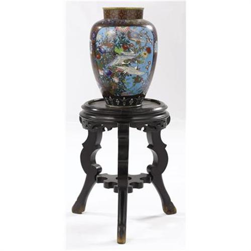 <B>An Asian Cloisonné Vase<BR></B></I>Unknown maker<BR>Late Nineteenth Century<BR>20 inches high<BR>Unmarked<BR><BR>The vase decorated with panels of cranes and quails amongst flowers on a blue ground, between the panels decorated with scrolls and florets on a brown ground, blue interior.<BR><BR><b>Shipping:</b> Requires 3rd Party Shipping (<a target="_blank" href="http://www.heritageauctions.com/common/shipping.php">view shipping information</a>)