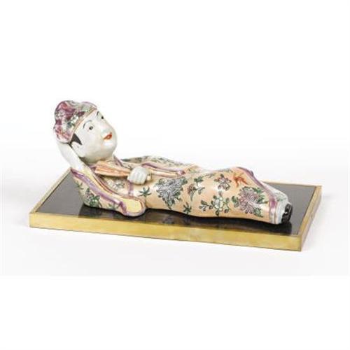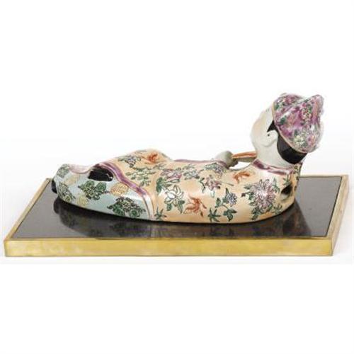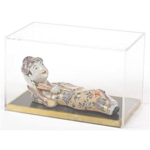 <B>An Asian Porcelain Figure<BR></B></I>Unknown maker<BR>Circa 1900<BR>The reclining figure on a marble base with a plexiglass cover<BR>Unmarked<BR>5.25 inches high x 13 inches long x 5 inches deep<BR><BR><b>Shipping:</b> Requires 3rd Party Shipping (<a target="_blank" href="http://www.heritageauctions.com/common/shipping.php">view shipping information</a>)
