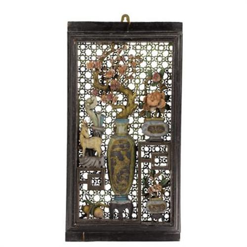 <B>An Asian Wood Panel<BR></B></I>Unknown maker<BR>Nineteenth Century<BR>The carved and polychromed panel depicting a flower vase with cherry blossom branches, a deer and various other flower pots<BR>Unmarked<BR>23 inches high x 13 inches wide<BR><BR><b>Shipping:</b> Requires 3rd Party Shipping (<a target="_blank" href="http://www.heritageauctions.com/common/shipping.php">view shipping information</a>)