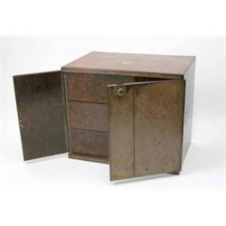 An Asprey’s burr walnut veneered humidor, of three drawers, each with flush-fitting brass handles, enclosed by a pair of doors, 16ins wide £250-300