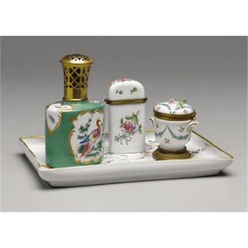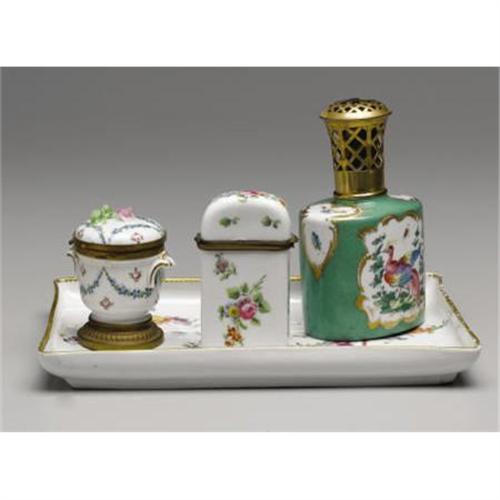 <B>An Assorted Group of Continental Porcelain<BR></B></I> Comprising a French porcelain squared tray, circa 1775; a French perfumer burner by Berger, Paris; a hinged etui decorated with floral sprigs; and a Sevres style inkwell decorated with floral garlands.<BR>Tray: 10-3/4 inches long x 7 inches wide<BR> <B>Condition Report:</B> Slight crack to edge of base of tray.<BR><BR><b>Shipping:</b> Hollowware/Pottery/Glass, Small (<a target="_blank" href="http://www.heritageauctions.com/common/shipping.php">view shipping information</a>)