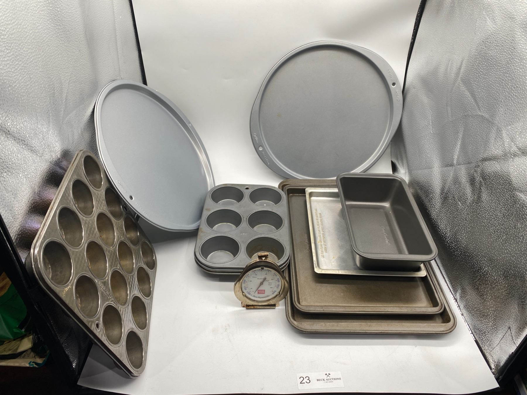 An Assortment of Baking Ware; including 4 baking pans, 2 pizza trays, 1 oven thermometer, and 4 baking trays.