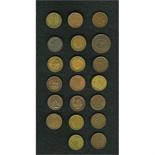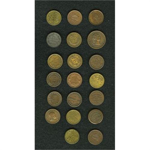 <B>An Assortment of Civil War Tokens.</B></I> The lot includes 16 Civil War store cards and four Civil War patriotic tokens. Grades range from VF to Uncirculated, and several examples display minor to moderate environmental damage.<BR><BR><b>Shipping:</b> Coins & Currency (<a target="_blank" href="http://www.heritageauctions.com/common/shipping.php">view shipping information</a>)