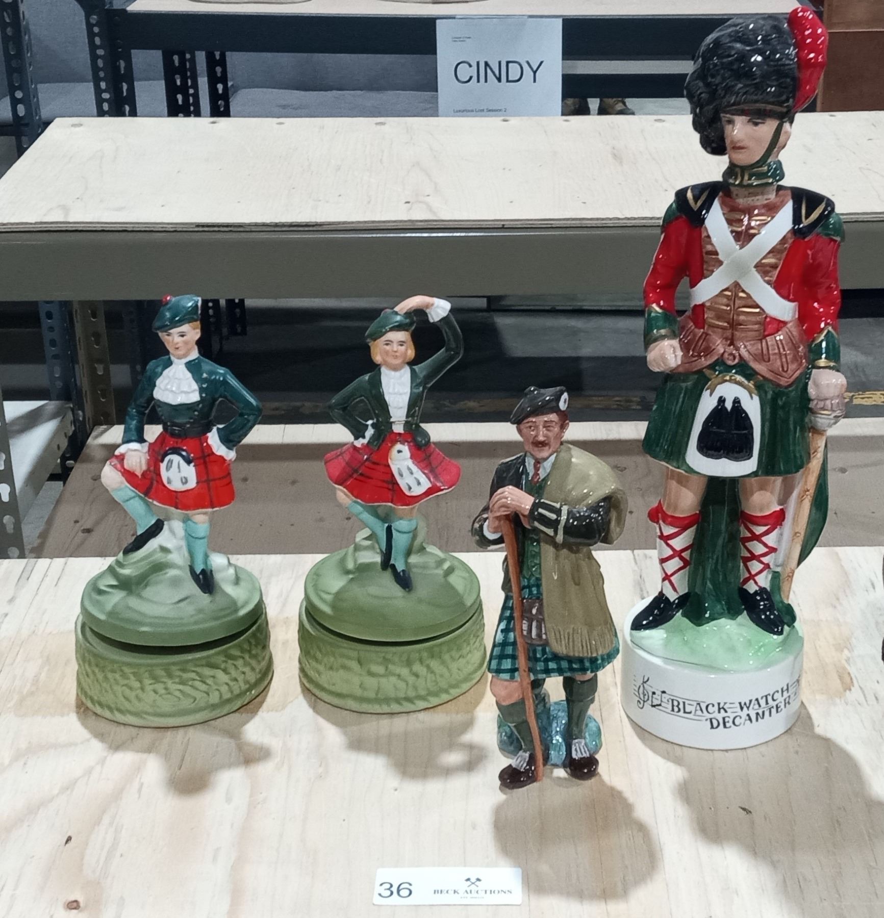 A Pair of Scottish-Themed Dancer(Red Kilt), One Green Kilted Gentlemen with a Walking Stick, and A Large Male Ornament in Scottish Military Garb, with a Turn Crank, that Plays Music that Delights the Ear.