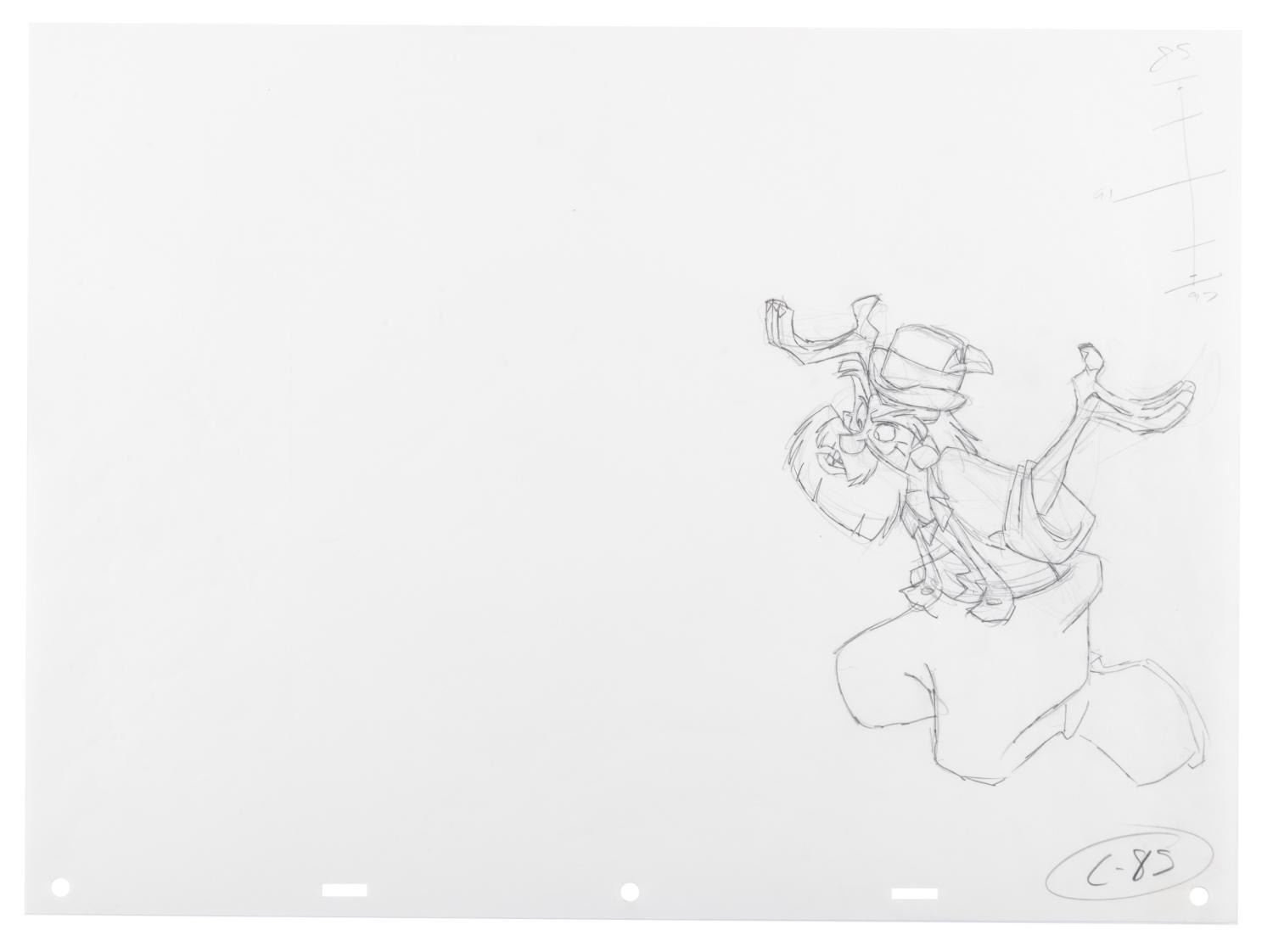 (Disney, 2001) An original production drawing of Cookie the cook from “Atlantis: The Lost Empire.” Cookie has an image size of 7” x 6” on 12.5” x 17” animation paper. The graphite drawing is in good condition with light edge wear and creasing throughout from production use.