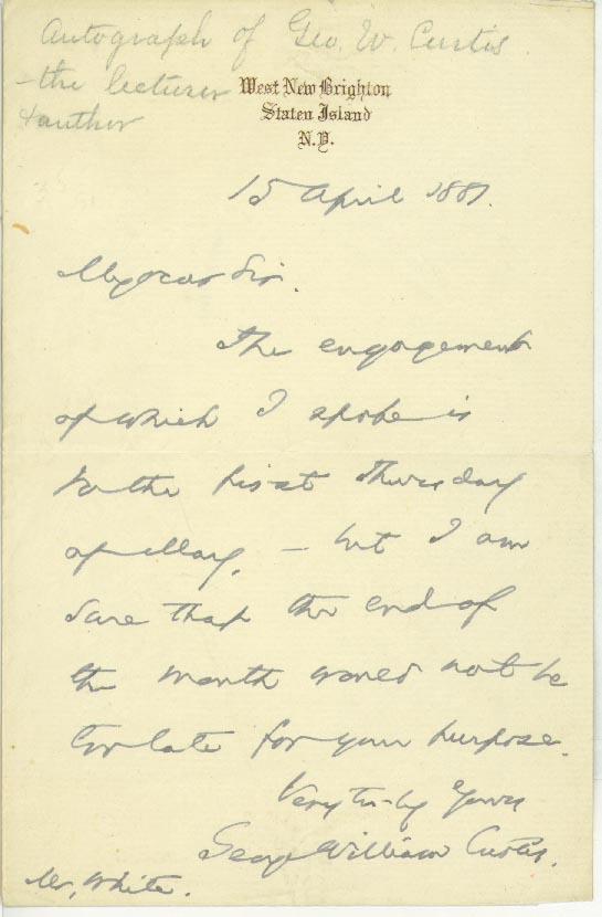 George William Curtis. ALS. 1pp. 4 1/2" x 7". Staten Island. 15 April 1887. An autograph letter signed by George William Curtis: "The engagement of which I spoke is to the first Thursday of May - but I am sure that the end of the month would not be too late for your purpose". The letter has very light toning and is in fine condition overall.