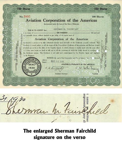 SHERMAN FAIRCHILD. 1930, Delaware. Certificate for 100 shares of the Aviation Corporation of the Americas issued to and signed "Sherman M Fairchild" on the verso. The certificate has a printed facsimile signature of CORNELIUS VANDERBILT WHITNEY as president. Green on white paper with black text. Lightly punch cancelled not affecting Fairchild's large signature in any way. It is in very fine condition.