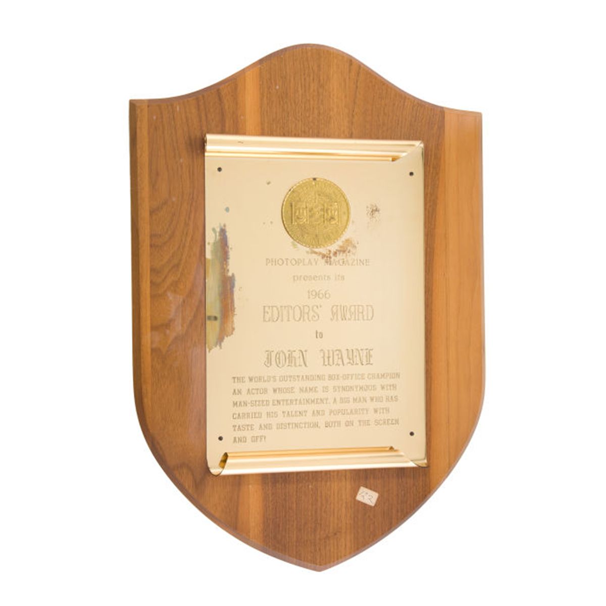 An Award, 1966. Presented to John Wayne; from Photoplay Magazine for "The World's Outstanding Box Office Champion..." in 1966; with a JW inventory sticker. (Please note this piece is tarnished and its finish worn off due to age.)19" x 13"