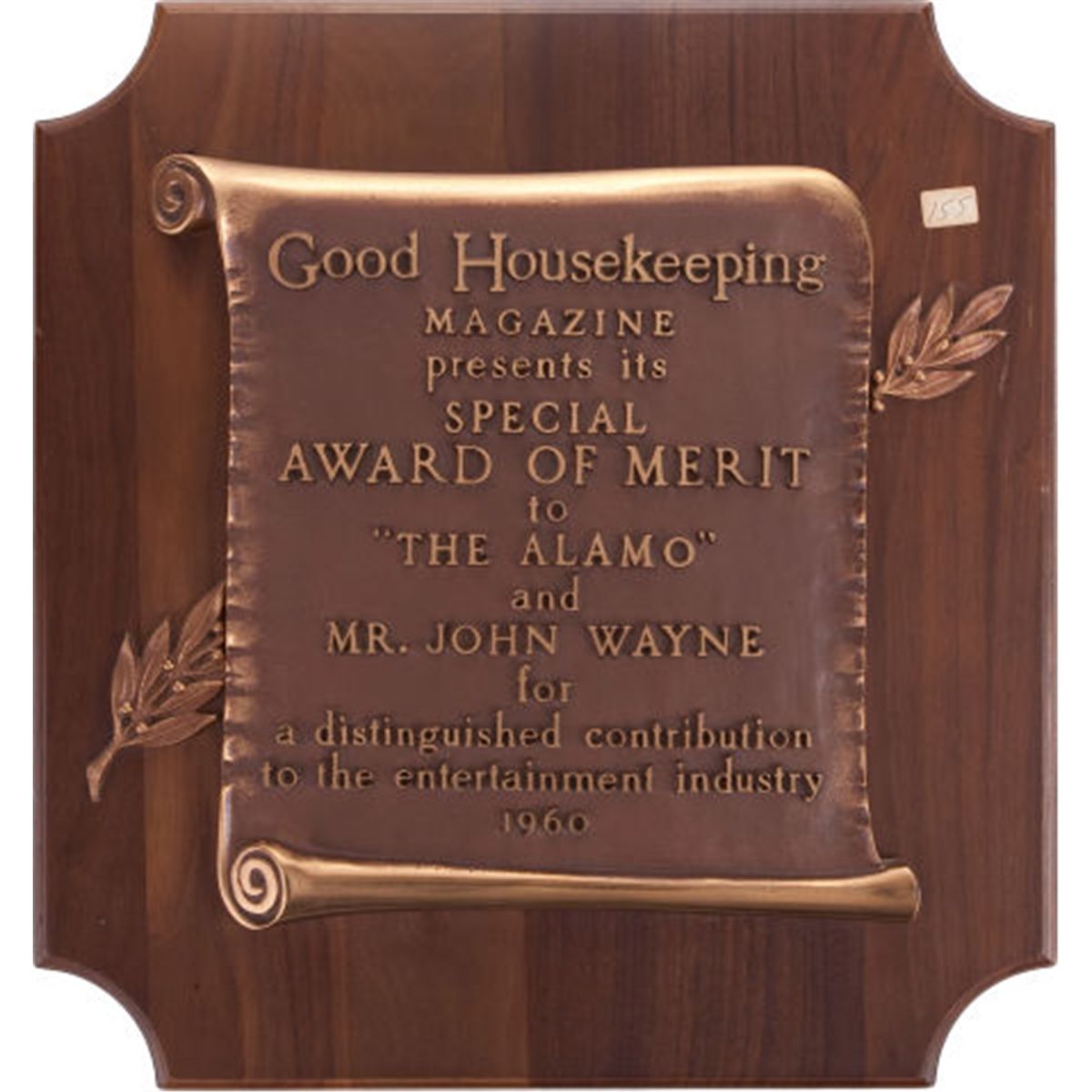 An Award for "The Alamo," 1960. Presented to John Wayne; from Good Housekeeping Magazine for the film; with a JW inventory sticker.15" x 14"
