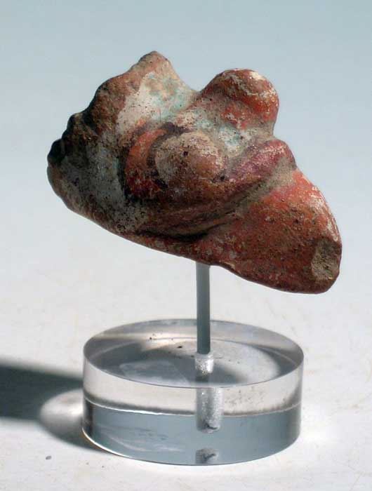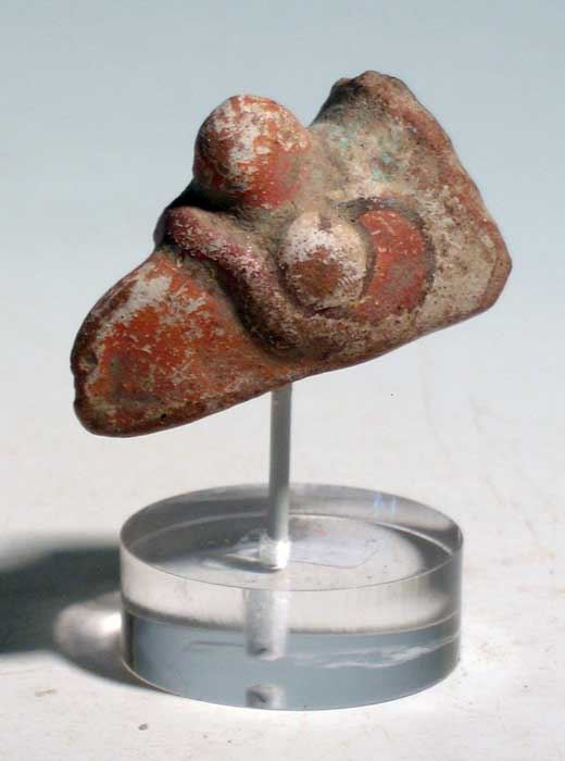 An Aztec avian head fragment from Mexico, c. AD 1400 - 1500, this polychrome head depicts the head of an eagle. It is covered with stucco slip and enhanced with red and black pigment. L: 1 5/8 in. Ex Foxworth estate.