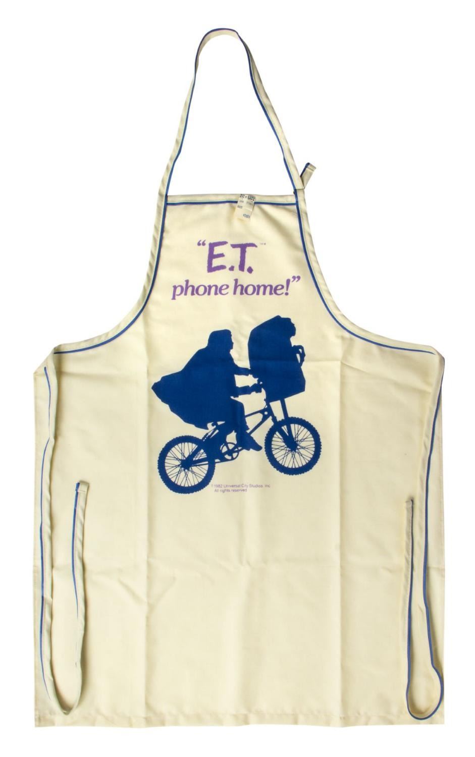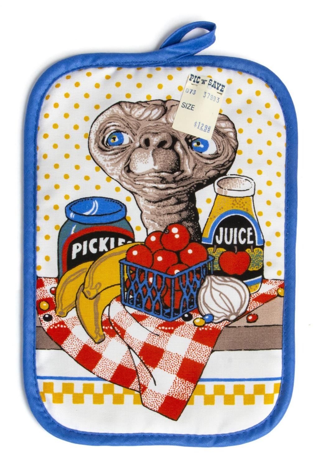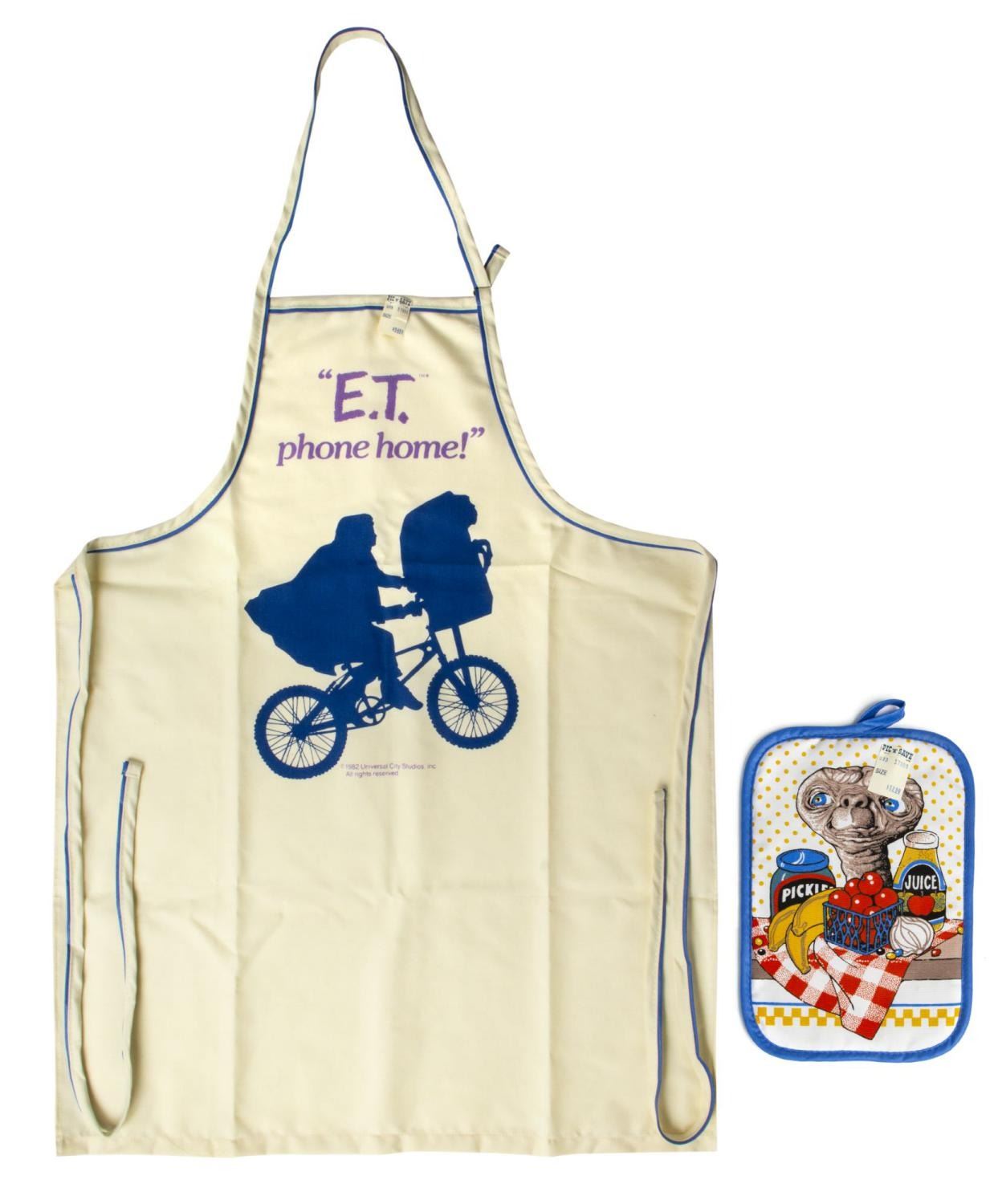 (Universal, 1982) An unused apron and pot holder themed to “E.T. the Extra-Terrestrial,” with the original tags. Measuring 32” x 35” and 10” x 7”, the apron and pot holder are in very fine condition.