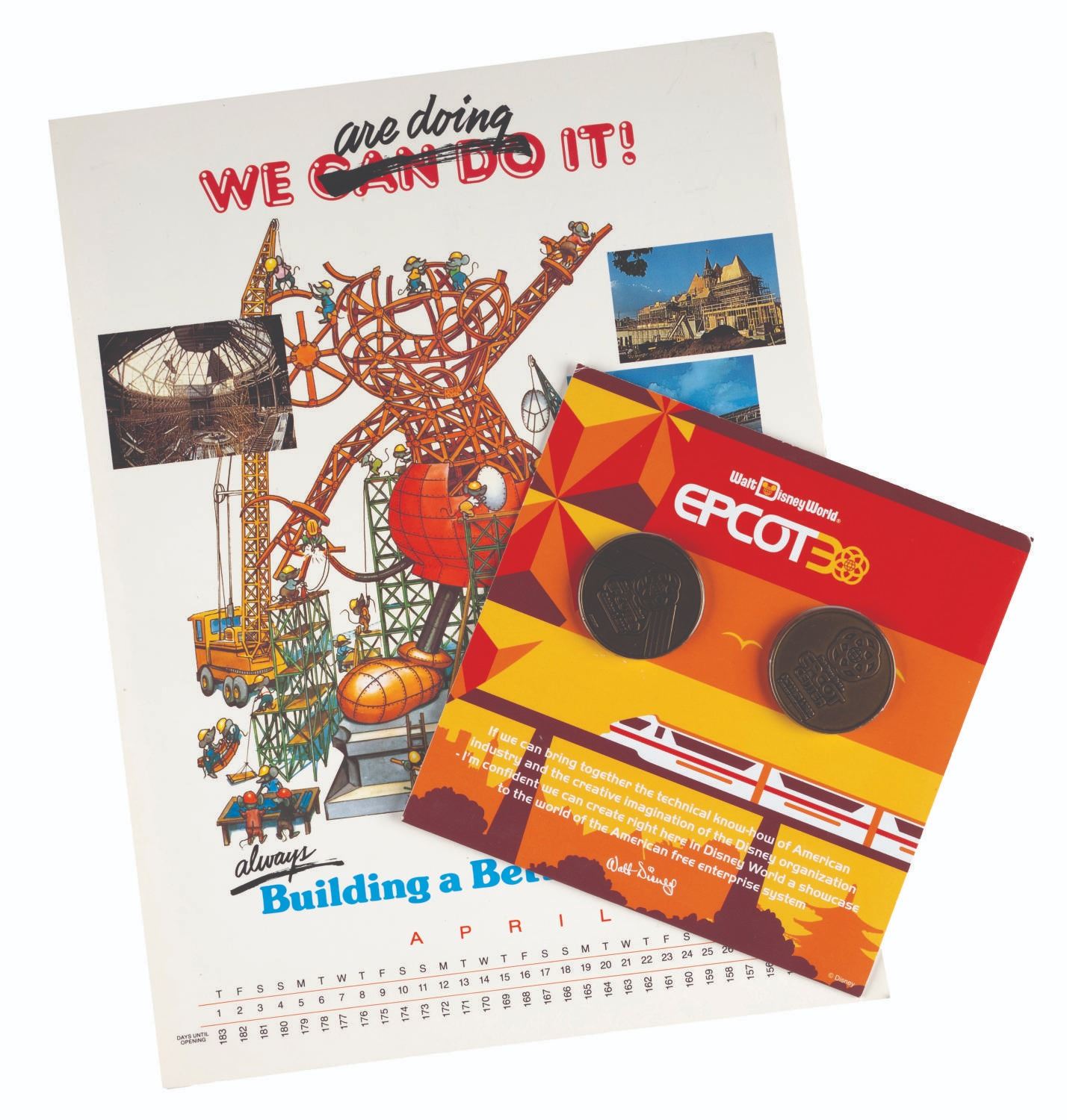(EPCOT, 1982-2012) An early "We Are Doing it" countdown poster for the opening of EPCOT, and a pair of medallions commemorating the Park's 30th anniversary. The coins measure 1.5" in diameter each on a 6" x 6" card, and the calendar measures 9" x 12". Both items are in fine to very good condition with light handling wear.