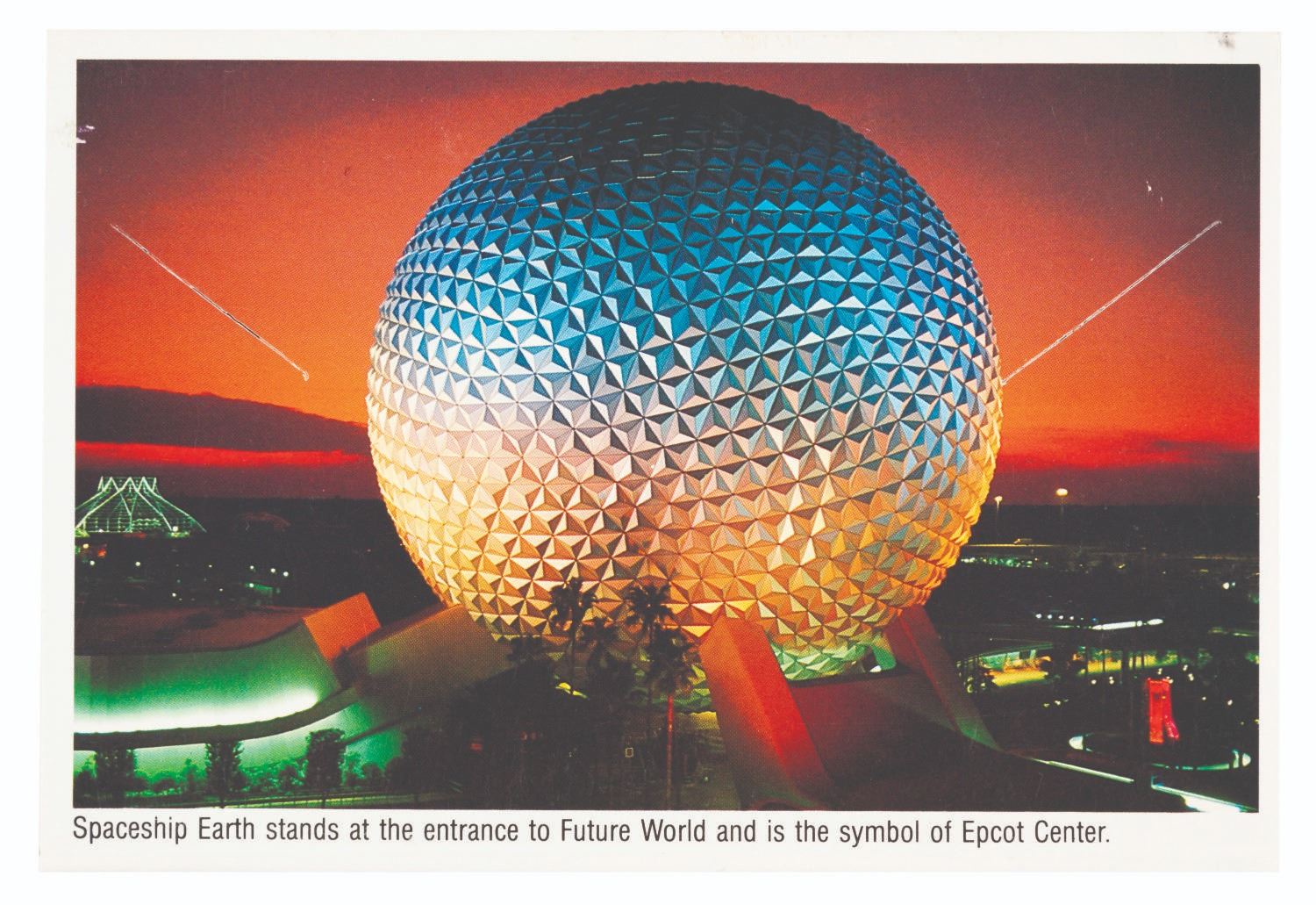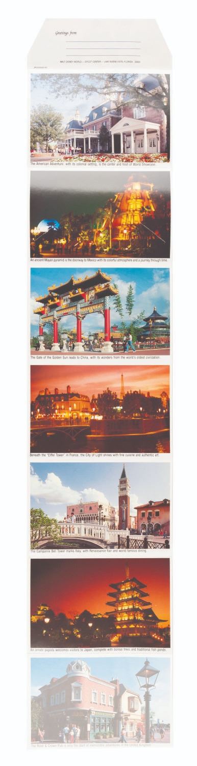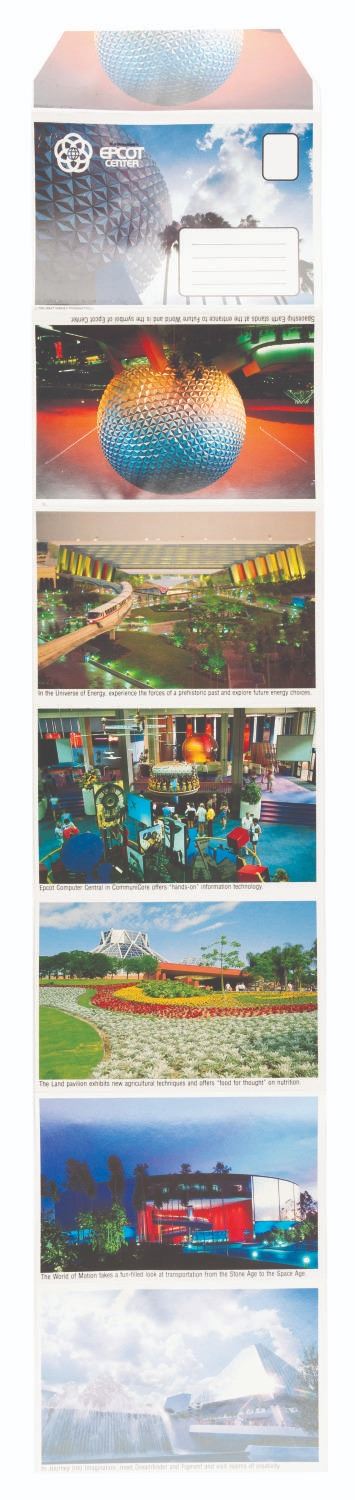 (EPCOT, 1983) A souvenir accordion mailer from EPCOT Center featuring 14 images of the Mexico, China, France, Italy, Japan, and UK Pavilions, the Universe of Energy, Spaceship Earth, Communicore, The Land, World of Motion, Journey Into Imagination, and American Adventure. Measuring 4" x 6", the mailer is in very good condition with very light soiling.