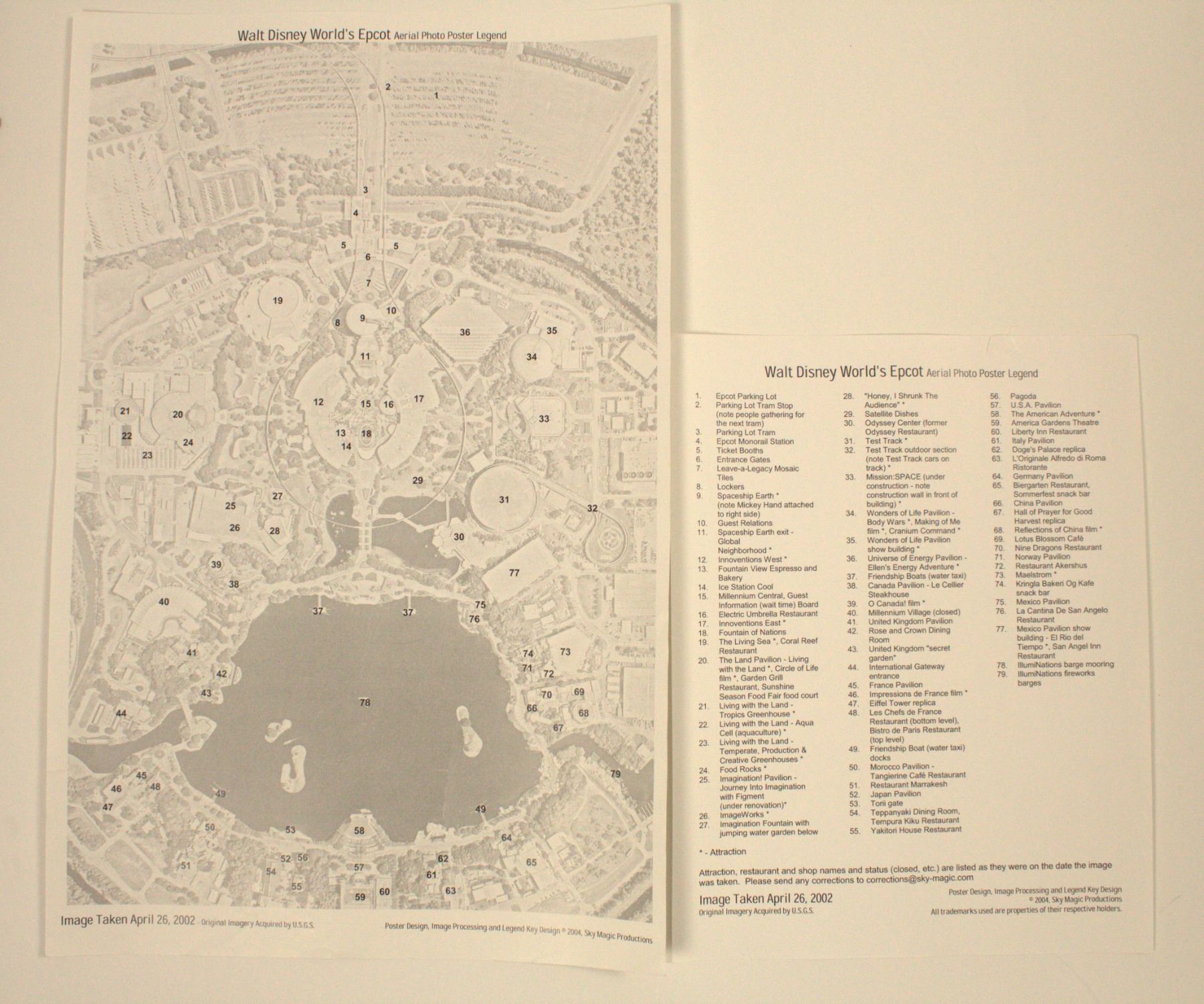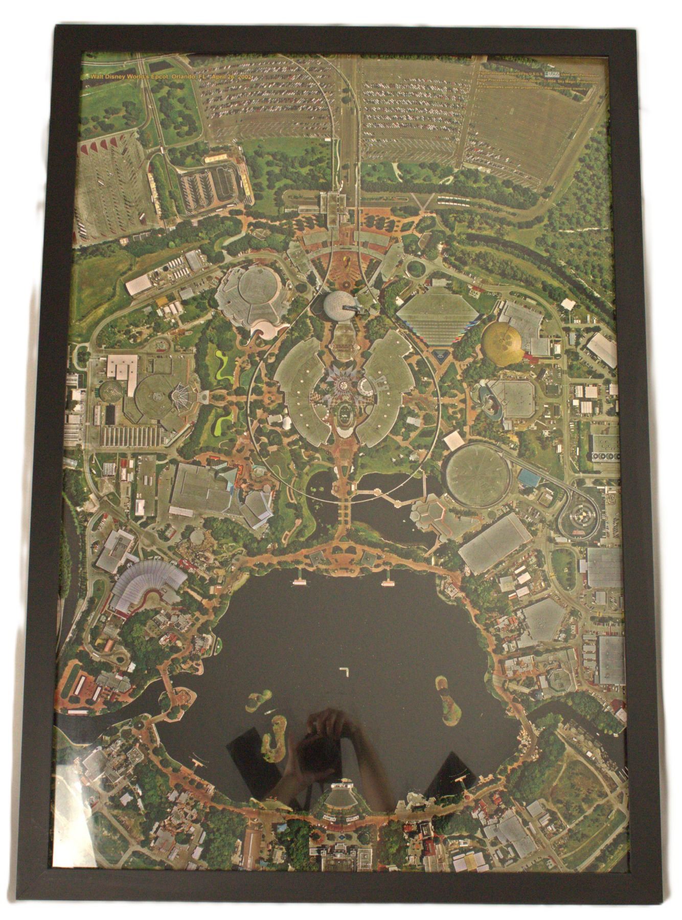 (Epcot, 2002) A stunning aerial photograph of Walt Disney World's Epcot, taken April 26, 2002.The image displays 23.75"x35.5" in a 26.25"x38.25" frame. The piece is in very fine condition with scuffs and a few signs of wear from handling or age.