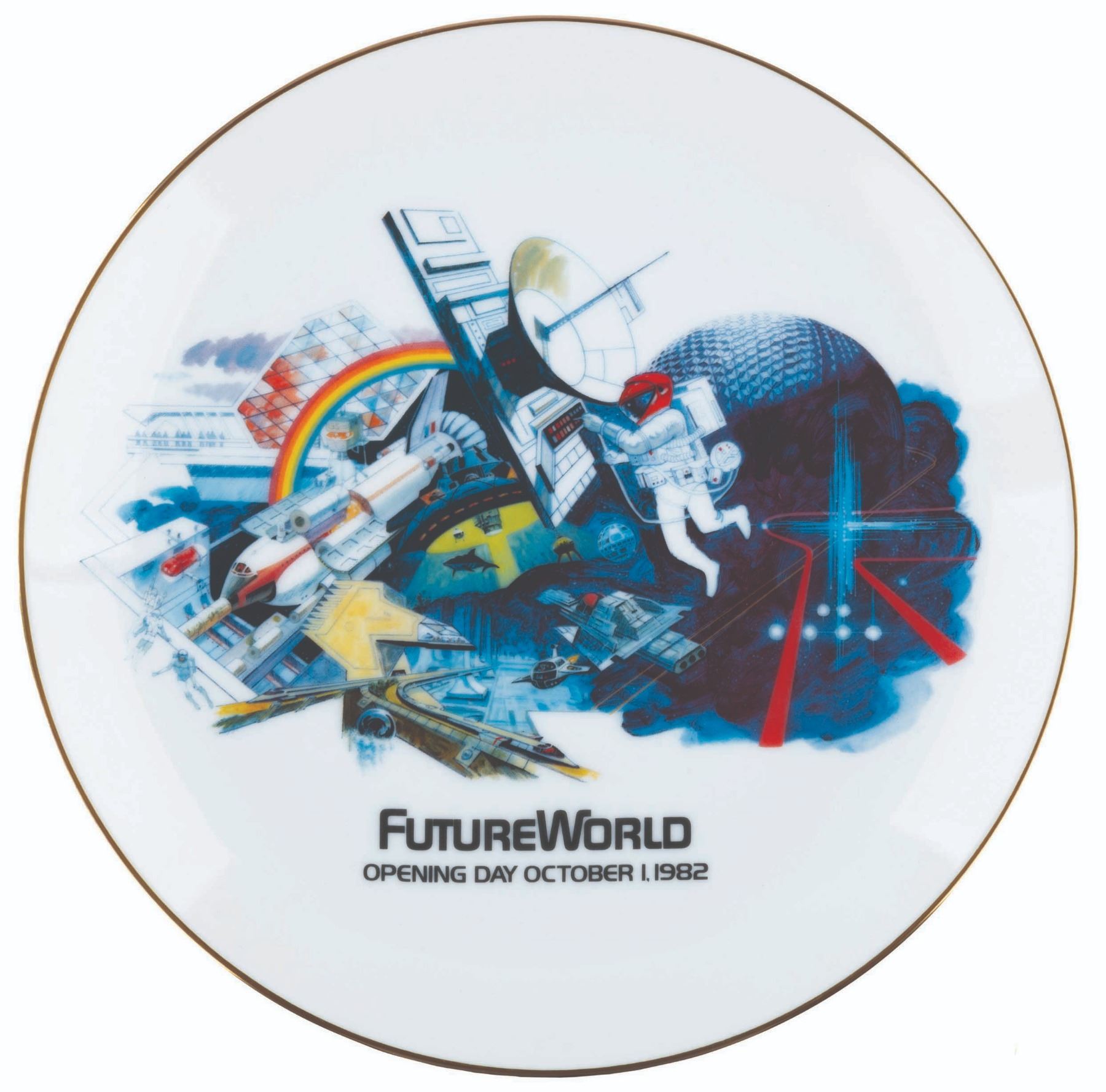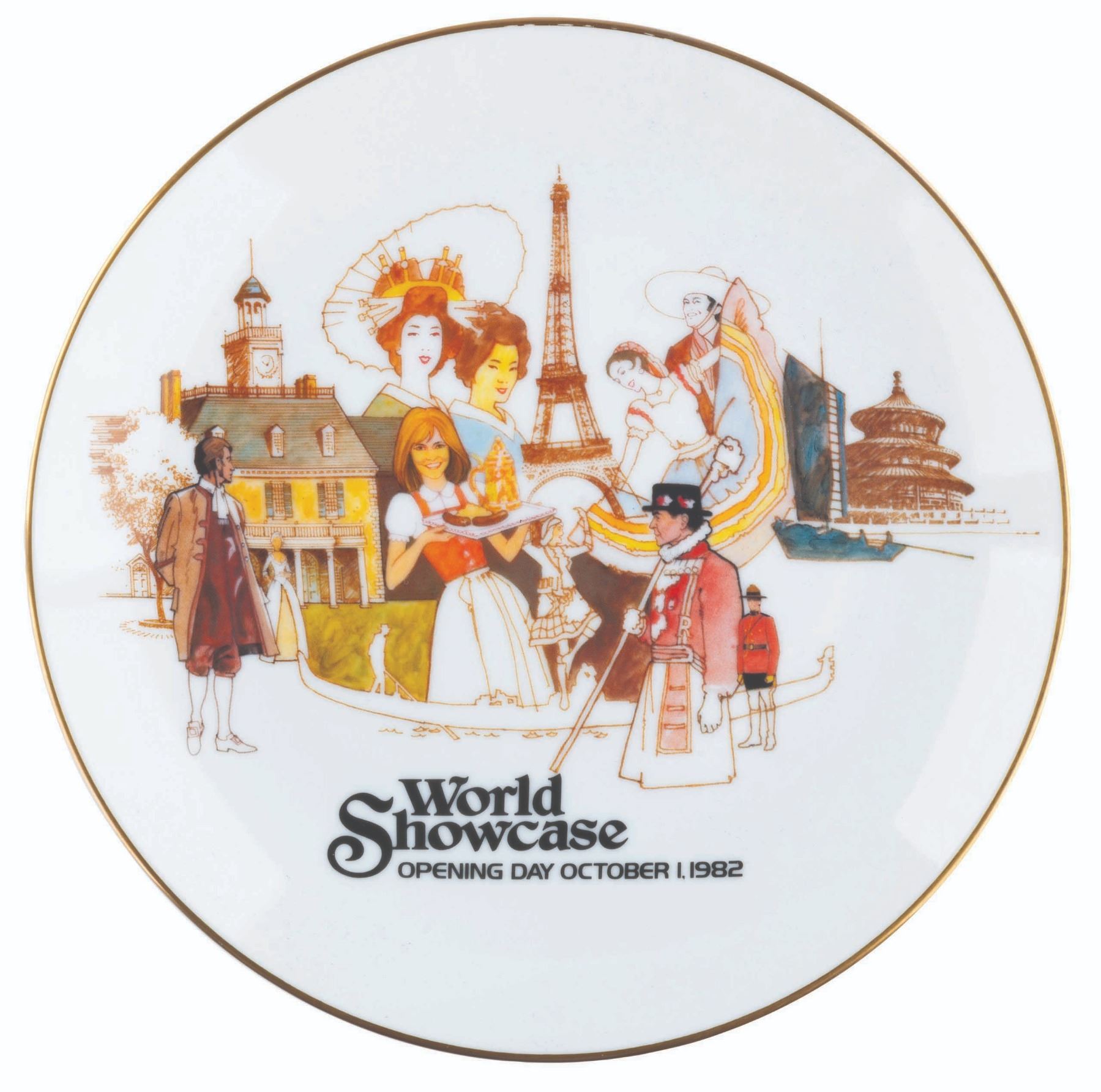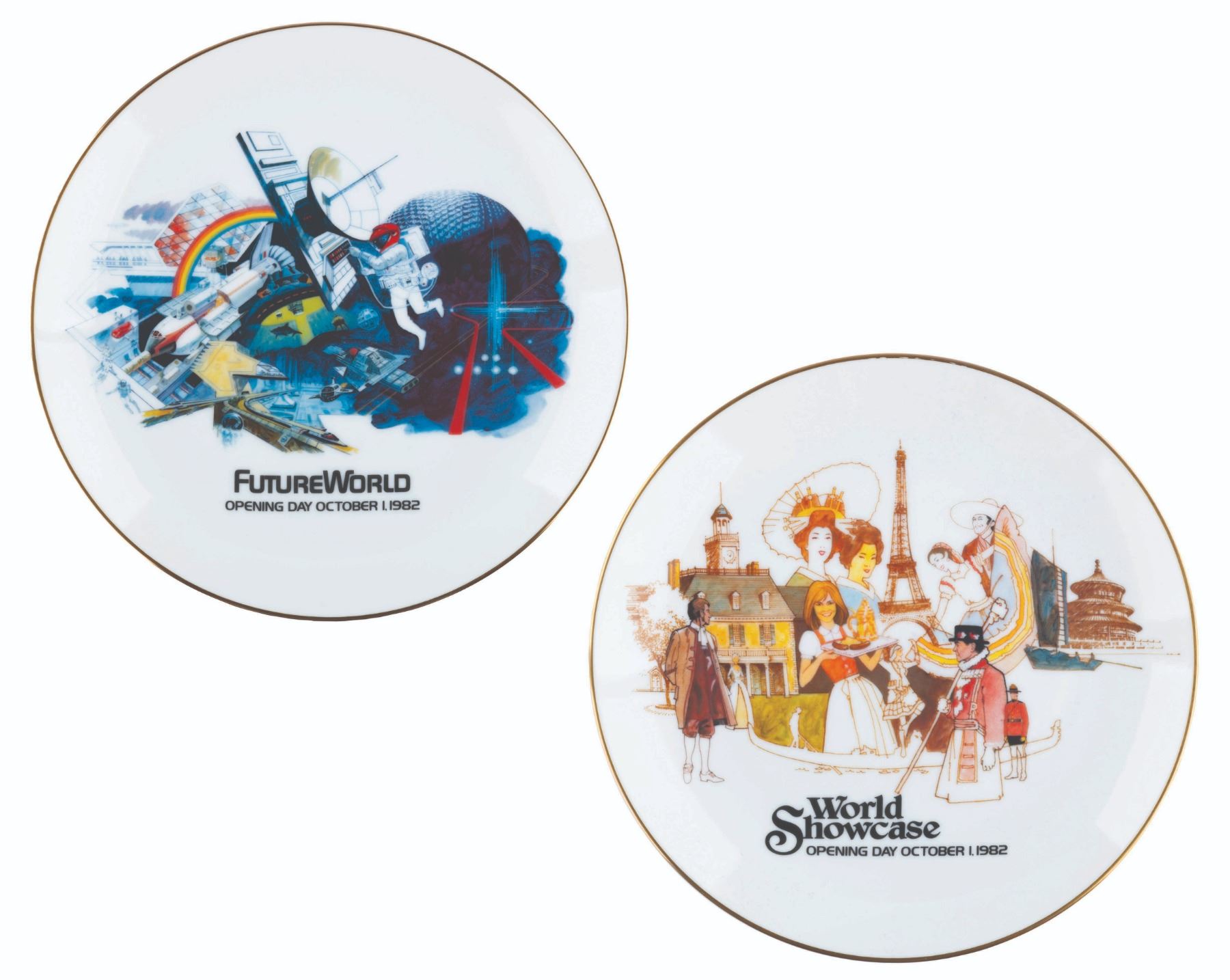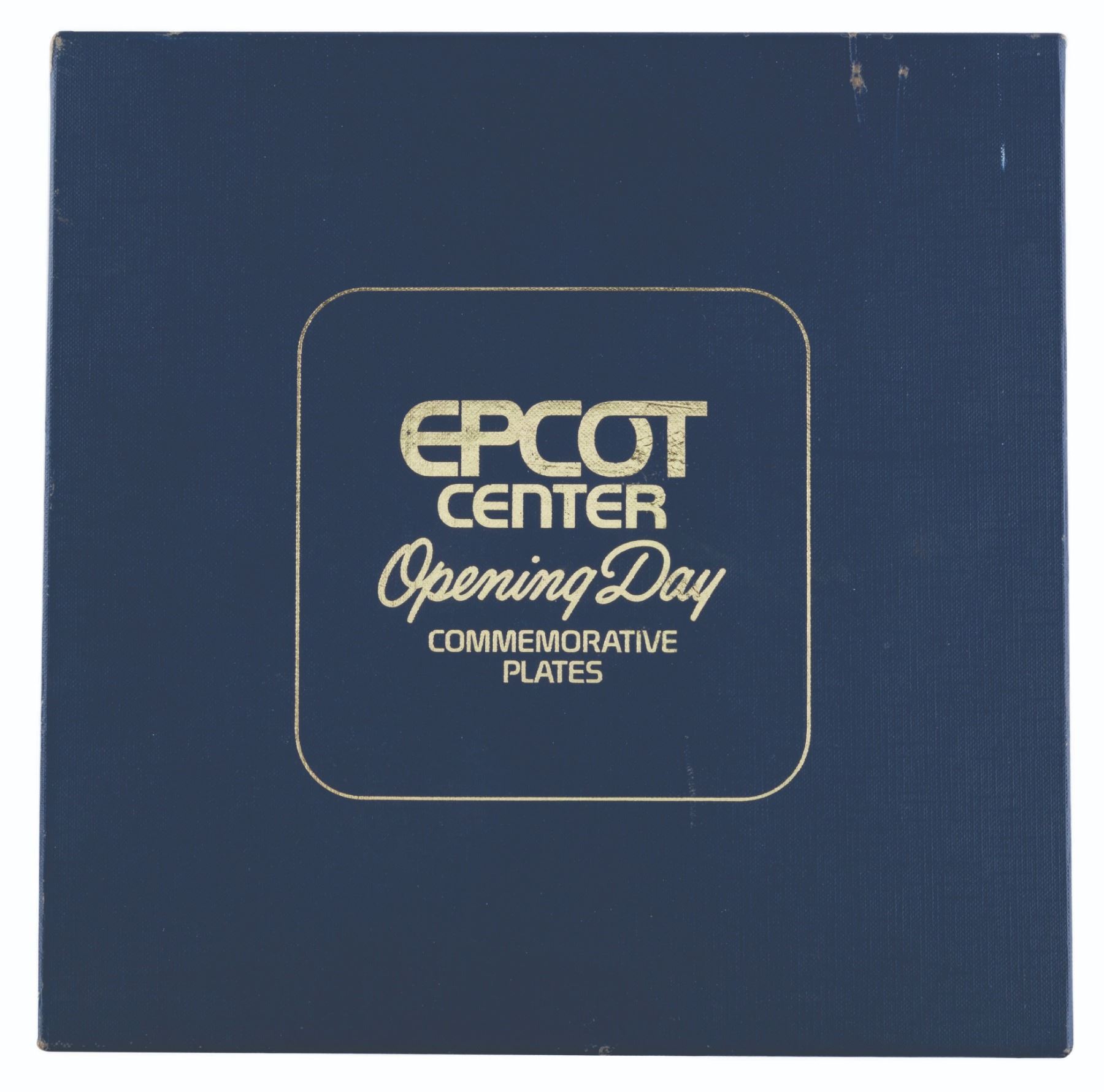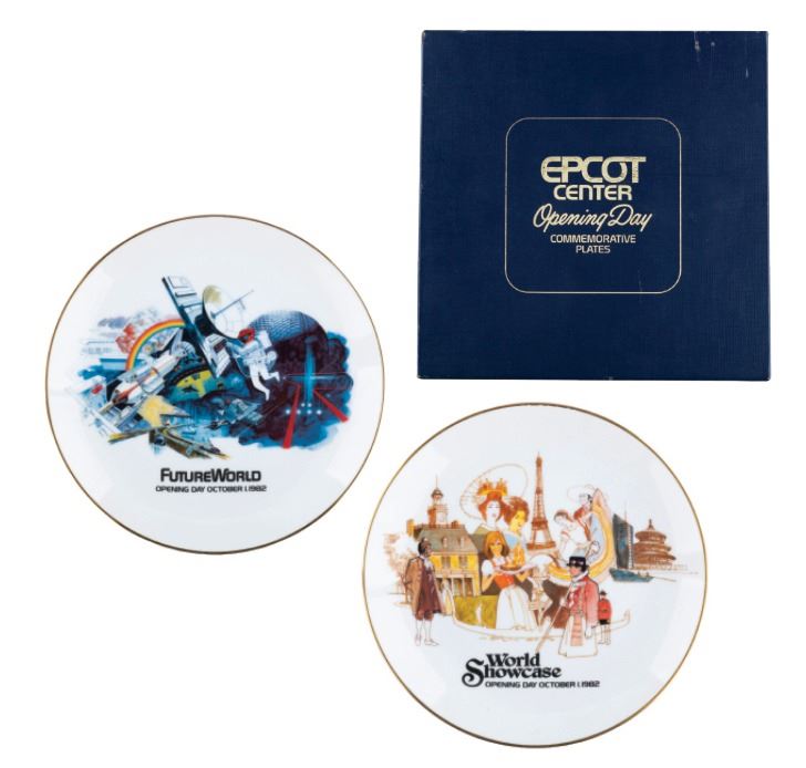 (EPCOT, 1982) An EPCOT Center Opening Day Commemorative plate set, celebrating Future World and the World Showcase. Measuring 8.75" in diameter, each limited edition plate is numbered 2826 of 7500 and is in fine as-new condition. The plates are housed in the hinged display box measuring 10" x 10" x 3" and in good condition with scuffs, scratches, and heavy wear to the corners.