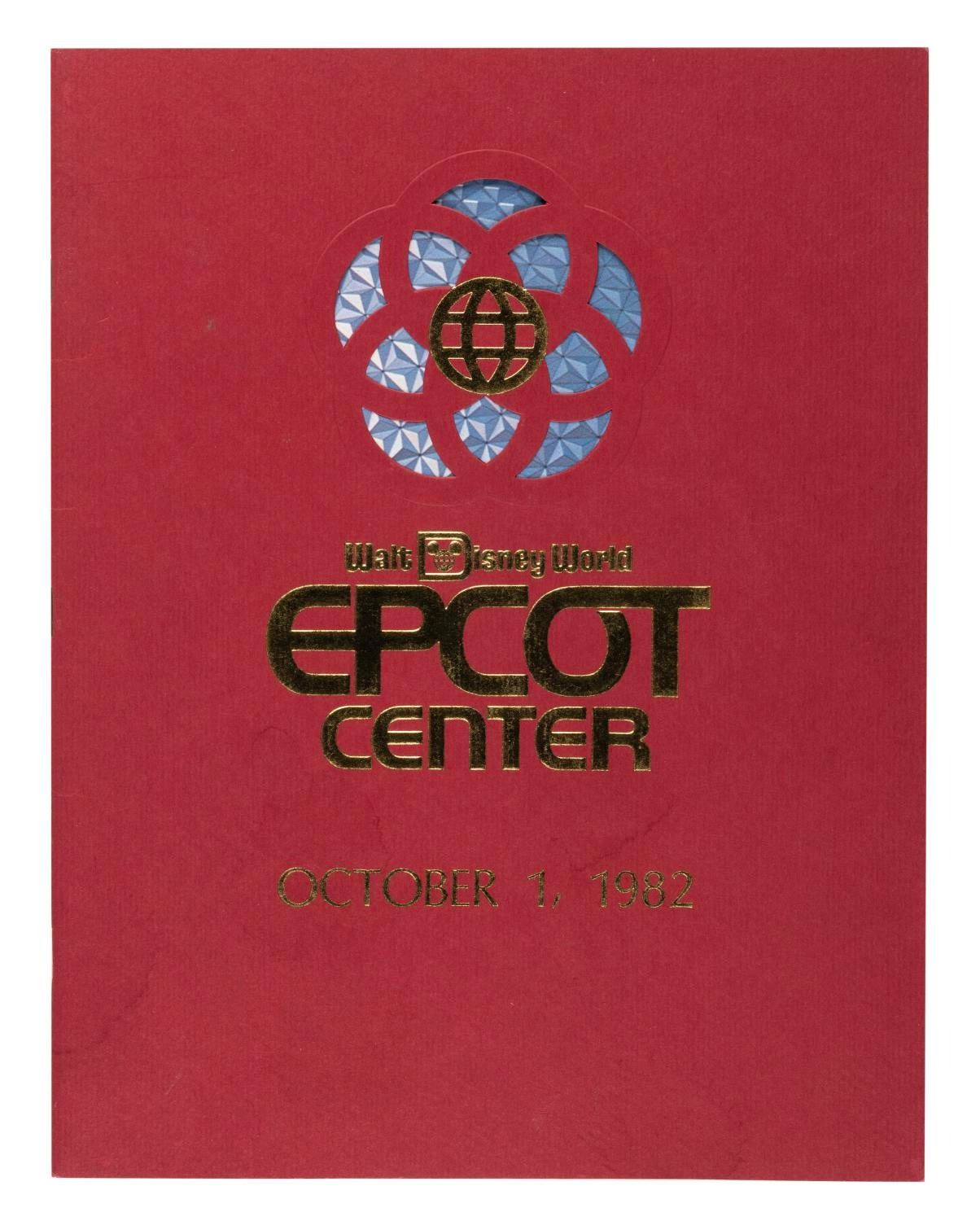 (EPCOT, 1982) A guidebook from October 1, 1982, the opening day of EPCOT Center. Inside are color photos and information on the attractions and pavilions that Guests will encounter. Measuring 8.5” x 11”, the guidebook displays in very good condition with light scratches, creases, and wear.