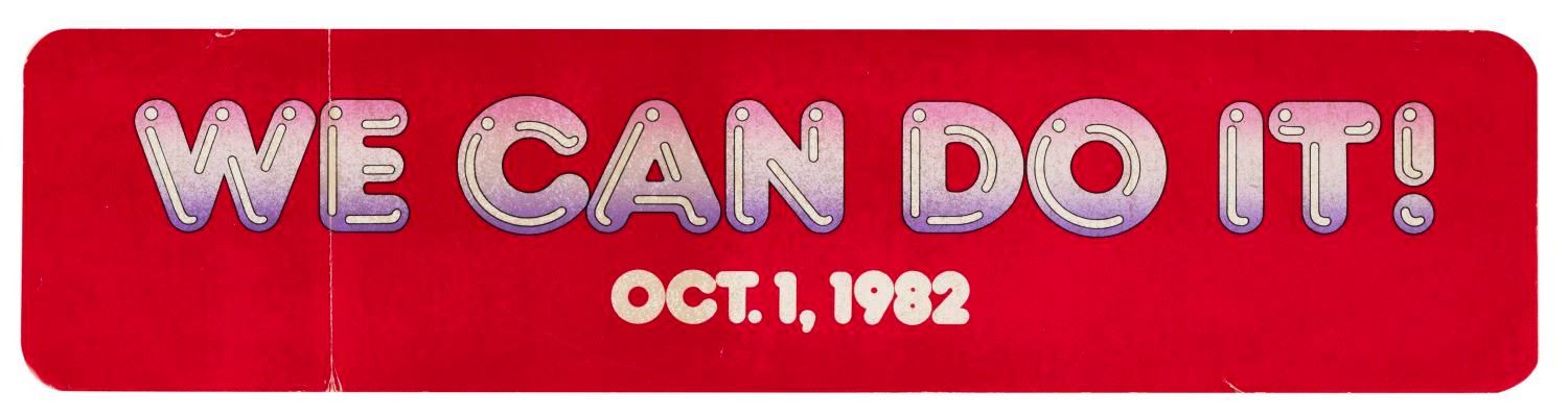 (Imagineering/EPCOT, 1982) A Walt Disney Imagineering exclusive bumper sticker produced to motivate the team to complete EPCOT by the scheduled opening on October 1, 1982. Measuring 3.25" x 13.5", the bumper sticker is in good condition with creases, edge wear, and a full vertical fold.