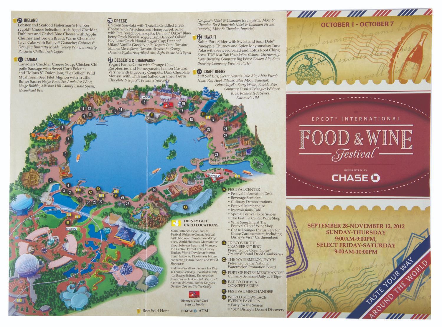 (EPCOT, 2012) An EPCOT International Food and Wine Festival brochure with information and a detailed schedule of the week's events. Measuring 9.25" x 25.5" fully extended, the brochure is in very good used condition with a few soft creases to the front and back cover and very minor edge wear.