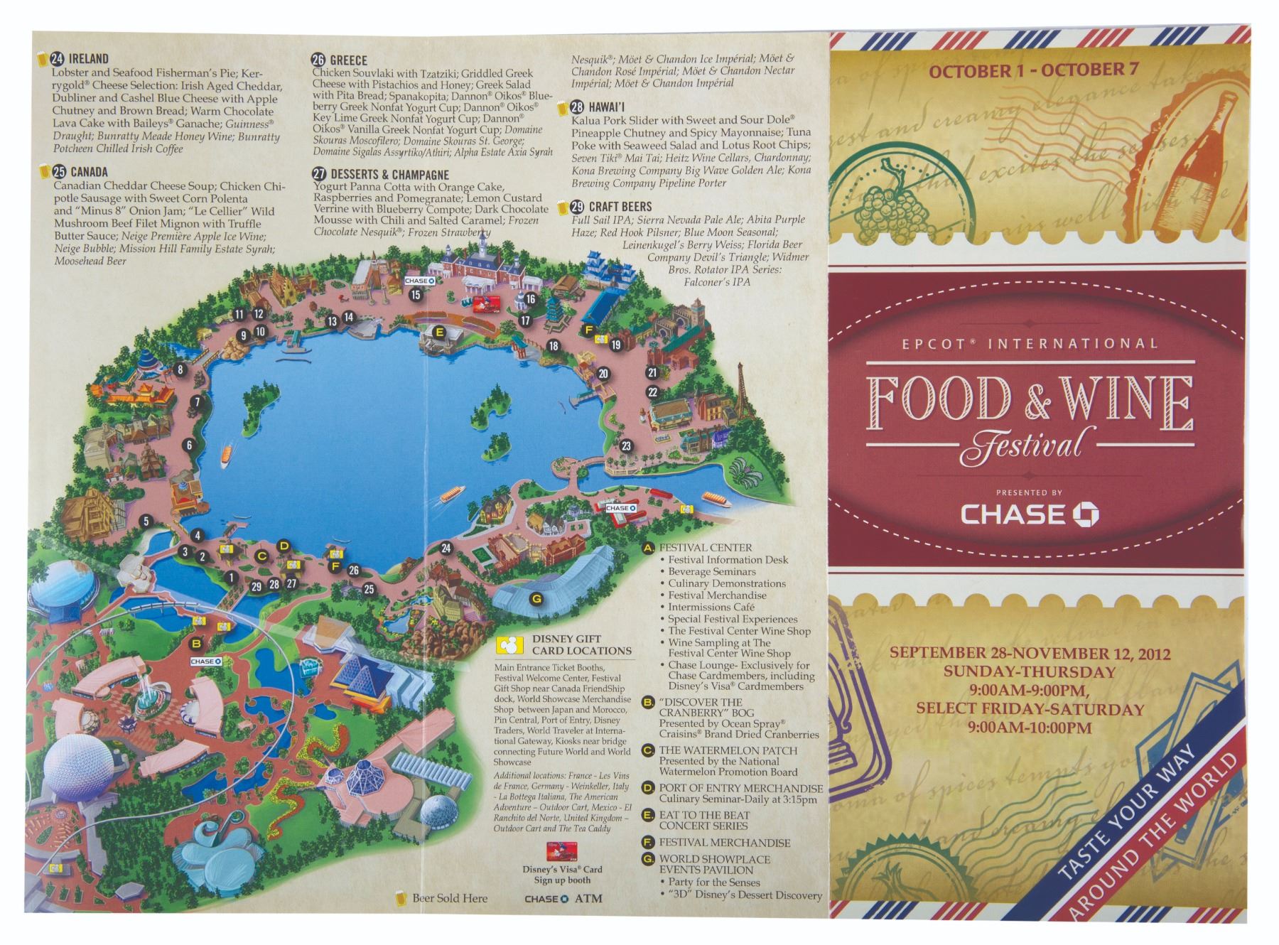 (EPCOT, 2012) An EPCOT International Food and Wine Festival brochure with information and a detailed schedule of the week's events. Measuring 9.25" x 25.5" fully extended, the brochure is in very good used condition with a few soft creases to the front and back cover and very minor edge wear.Est. Opening Bid: $20.00