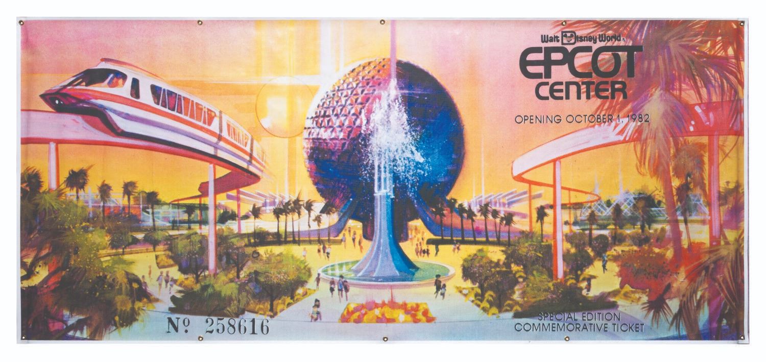 (EPCOT, 1980-90s) A giant banner displayed for the October 1982 Grand Opening of Walt Disney World’s EPCOT Center, featuring the same artwork on the Park’s commemorative tickets. Measuring 49” x 108”, the vinyl banner is in good condition with soiling and discoloration from Park use.