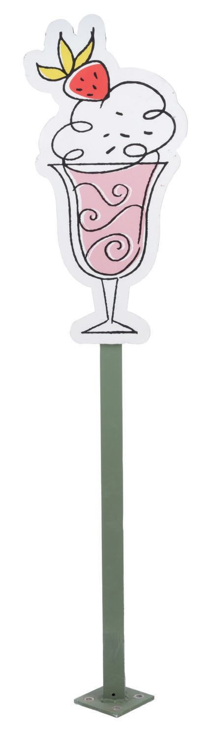 (EPCOT, 2019) An EPCOT International Food and Wine Ice Cream Sign. The one-sided figural sign features stylized printed applique imagery of an ice cream and is attached to a metallic backing with welded stand. Measuring 47" tall and 10.5" wide, the sign is in very good condition with scuffs, scratches, and wear from Park display and handling.