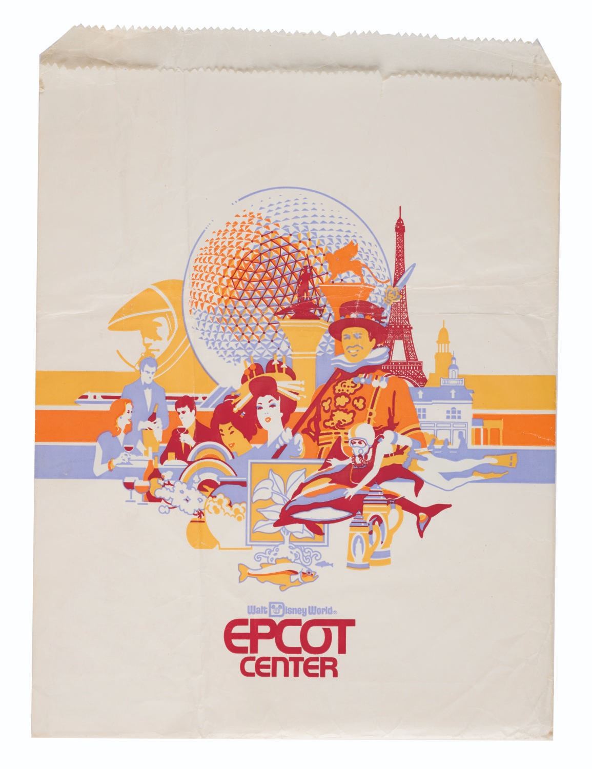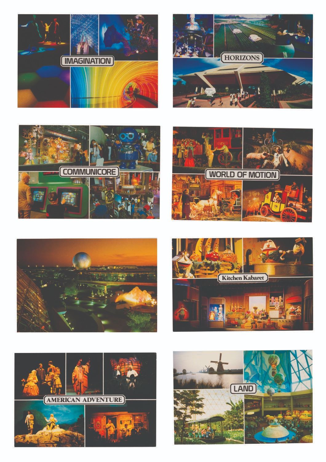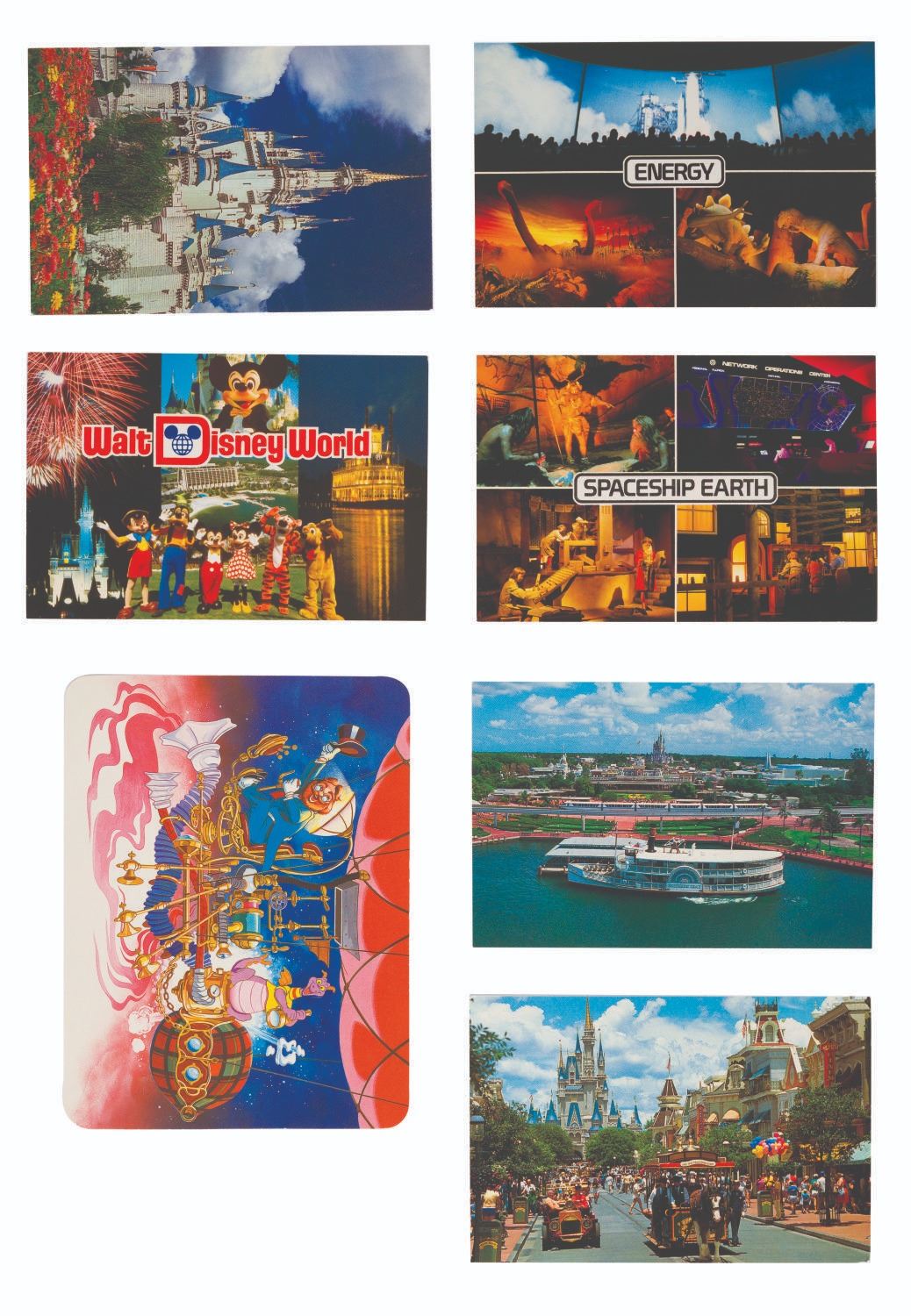 (Walt Disney World, 1985) A collection of 15 Walt Disney World and EPCOT postcards. Featuring scenes such as Kitchen Kabaret, World of Motion, the Land Pavilion, Horizons, American Adventure, Communicore, Spaceship Earth, the Dreamfinder, and many more. The collection also includes an EPCOT Center shopping bag and the original receipt for some of the postcards. Measuring 4” x 6” to 8.5” x 11.5”, the collection of postcards is in fine condition, and the bag is in good, used condition with creasing, folds, discoloration, and small tears.