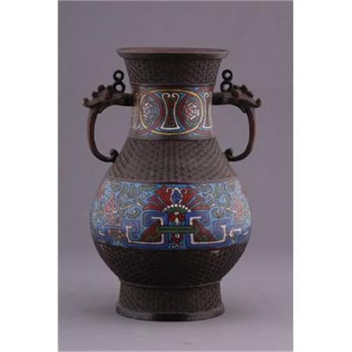 Nice Japanese cloisonné vase with dragon-shaped double-ears, decorative bands in enamel red blue, green and white to neck and dody, base applied with a seal of the Bunsei Period (1818-1829) of Edo Era. Height: 12", Mouth diameter: 5 1/8" and Bottom diameter 5".