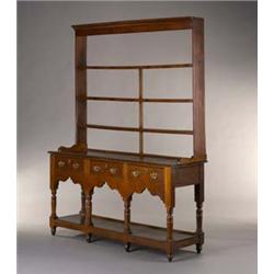 An Early 19th Century Dresser], the rack with coved cornice over four shelves, the base with three frieze drawers over a shaped, multi-arched apron, on turned legs united by a pot board, on turned feet, {200cm by 161cm by 46cm} £2500-3500