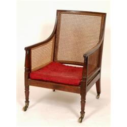 An Early 19th Century Mahogany Bergere Armchair, with single cane back and sides, on tapering turned front supports, on brass castors See illustration £100 - 150