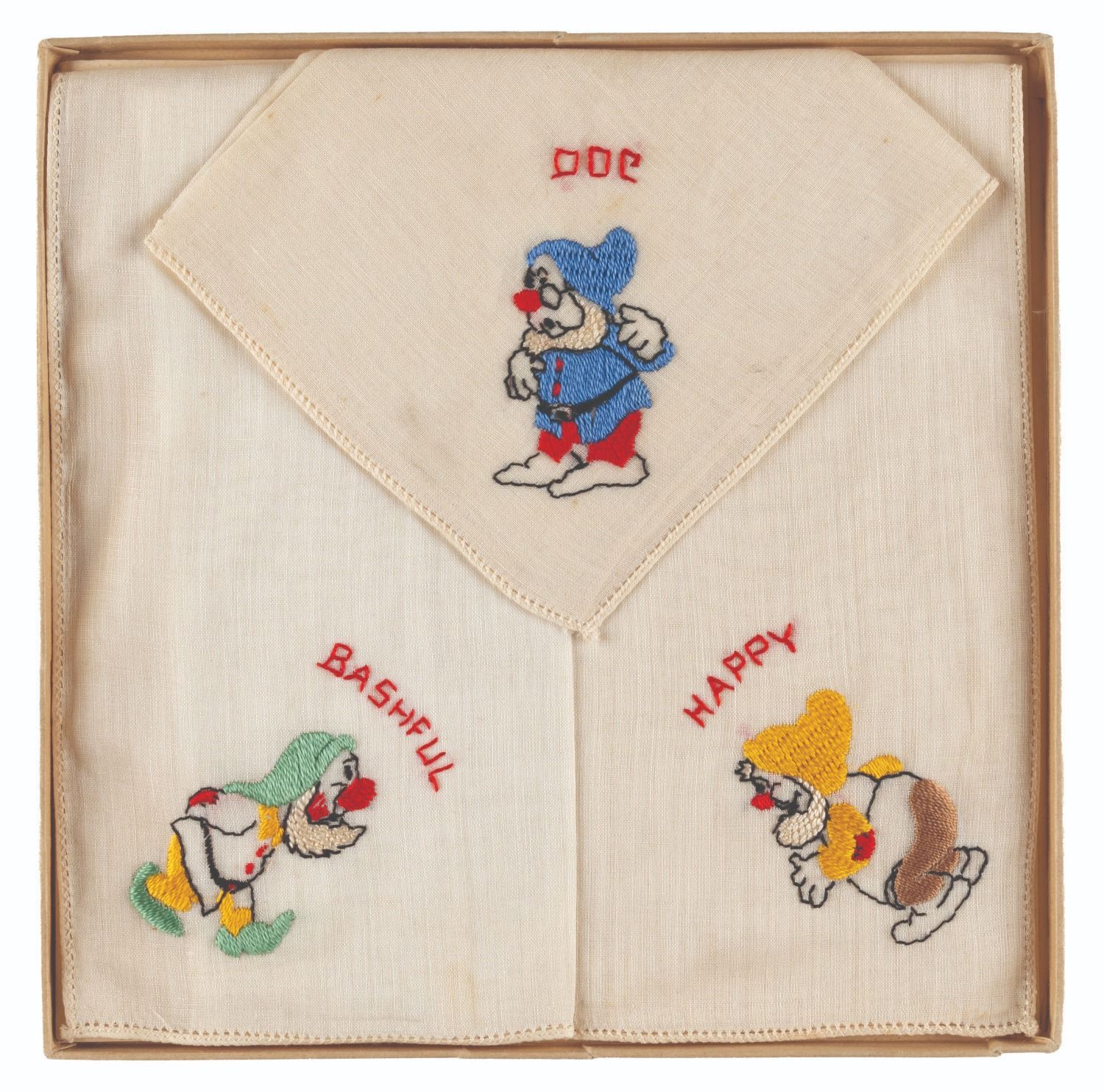 (Disney, 1938) A Walt Disney Handkerchiefs boxed set, featuring three linen handkerchiefs with embroidery of Bashful, Doc, and Happy from Disney’s “Snow White and the Seven Dwarfs.” Measuring 8" x 8.75" each, the handkerchiefs are in fine condition with very light smudges on Doc, and are with the original 7.25" x 7.25" box with wear from age and handling along the edges.