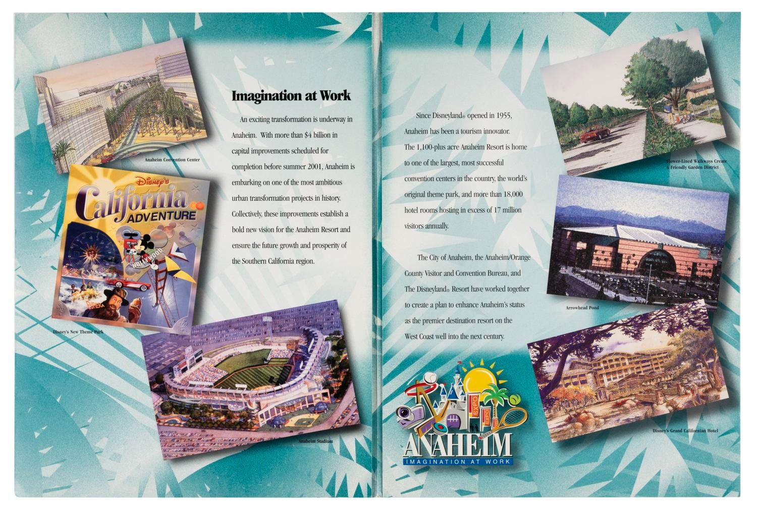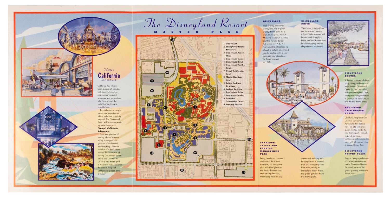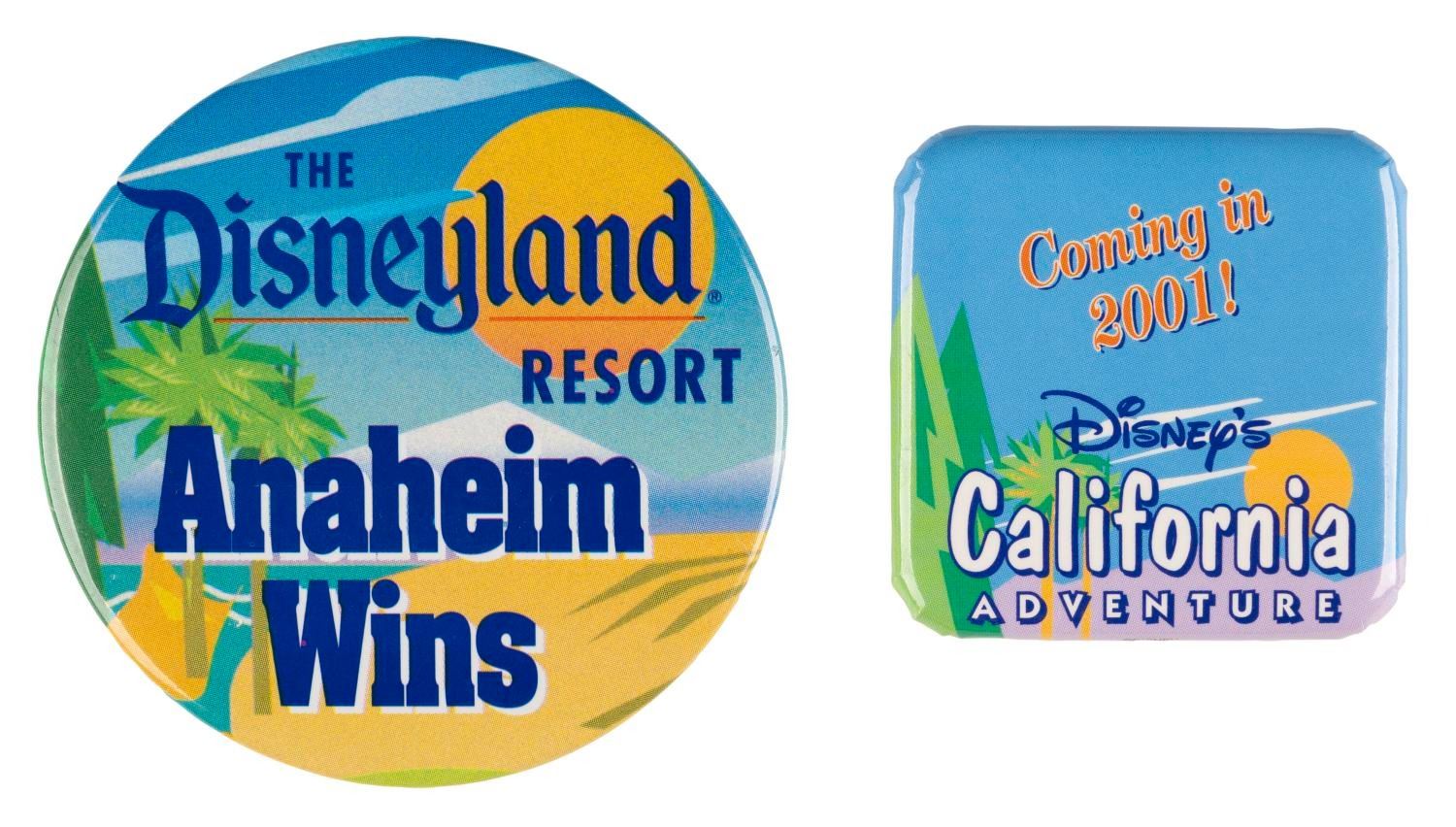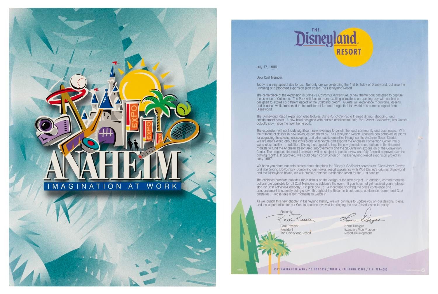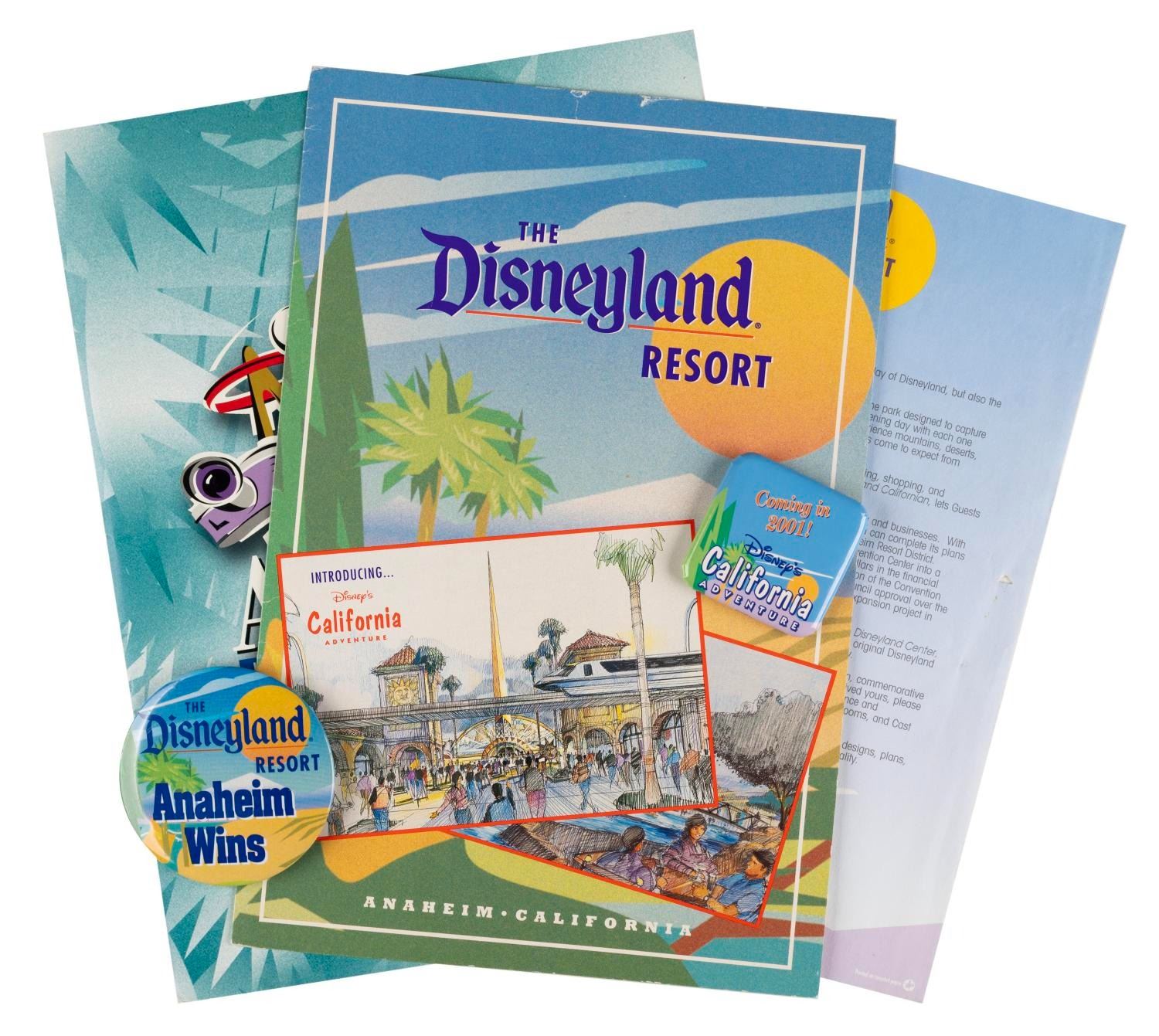 (Disney's California Adventure, 1996-2001) A collection of early Disney's California Adventure items including a Disneyland Resort brochure and Anaheim Imagination at Work folder announcing the upcoming changes around Disneyland, a letter to Cast Members dated 1996 announcing the new Park, and a pair of buttons announcing the Disneyland Resort and California Adventure Park. The buttons are in fine condition, with the paper pieces in good condition with handling wear, small creases, scuffs, and a small tear to the letter.