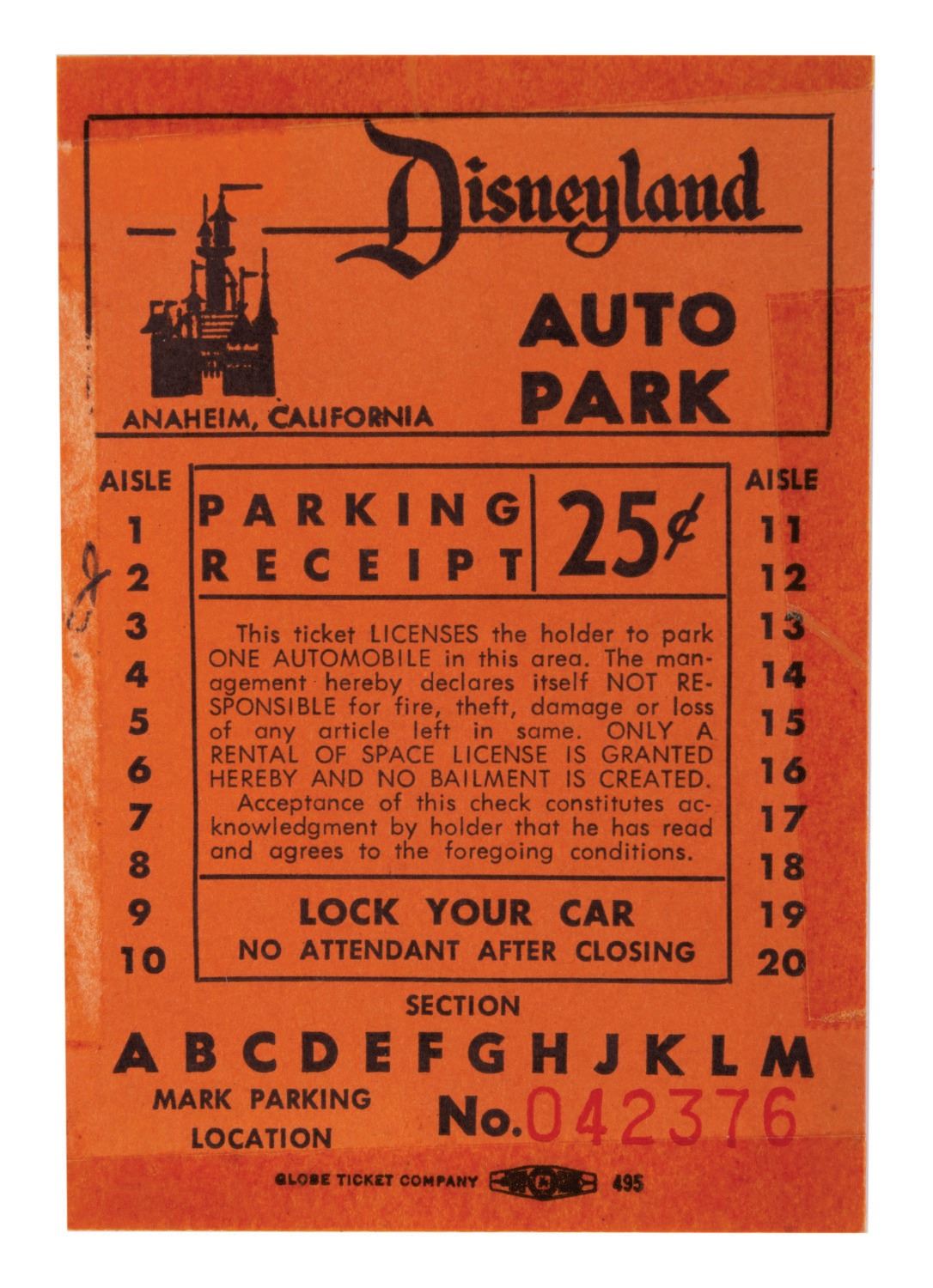(Disneyland, 1950s) An early Disneyland Auto Park Parking Receipt ticket. The earliest parking tickets read "Auto Park" at the top alongside the Sleeping Beauty Castle logo with parking sections A-M listed below. Measuring approximately 2.75"x4.25", the ticket is in good condition is very good with tape around edges from mounting and wear from handling.