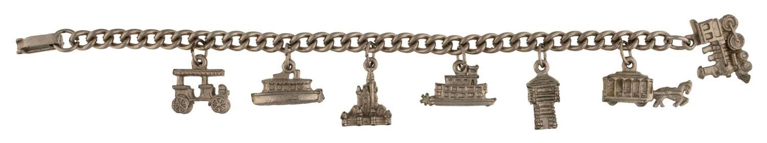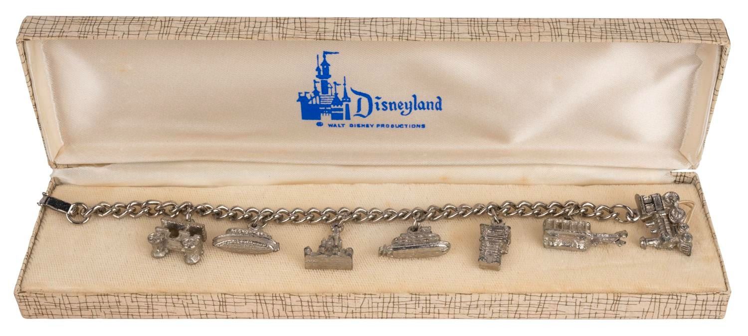 (Disneyland, 1950s-60s) A Disneyland Magic Charm Bracelet featuring a silver-toned chain with seven Disneyland attraction charms. Measuring 7" long, the bracelet is in very good condition with light wear and a spot of patina on the Horse-drawn carriage.