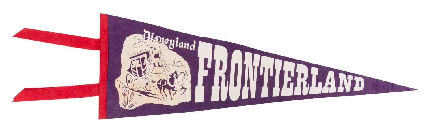 (Disneyland, 1955) A rare and unusual Frontierland pennant from Disneyland. Among the first souvenirs ever produced, the felt pennant features screened graphics based on early conceptual artwork for the Park. Measuring 8.5" x 222.5", the felt pennant is in very good to fine condition, with very little sign of wear from age.