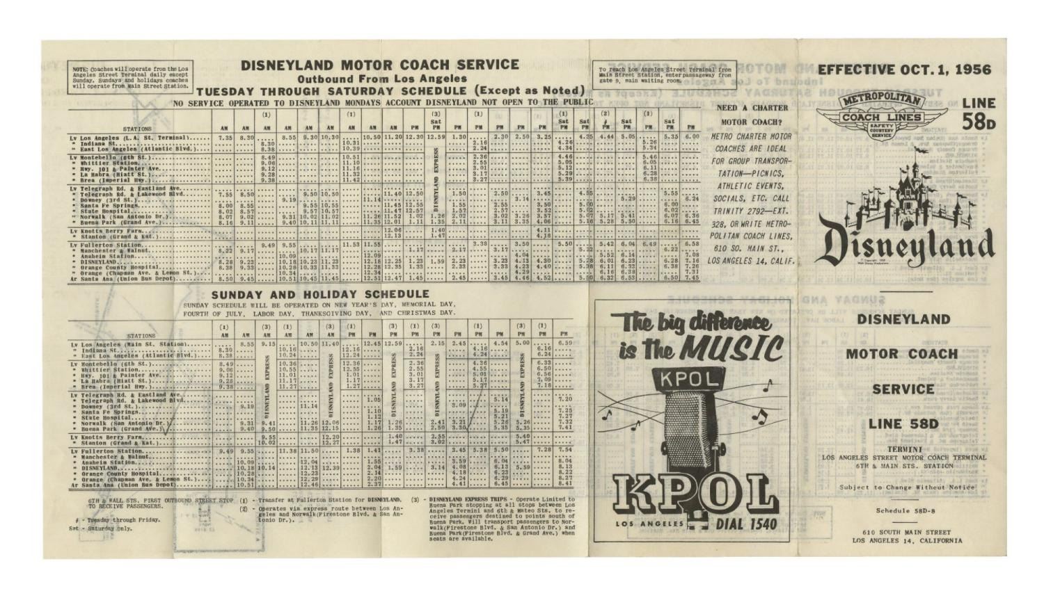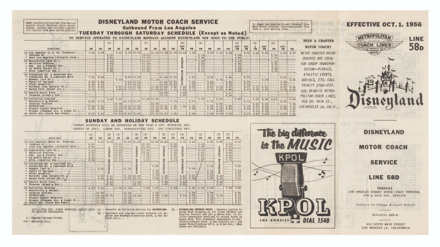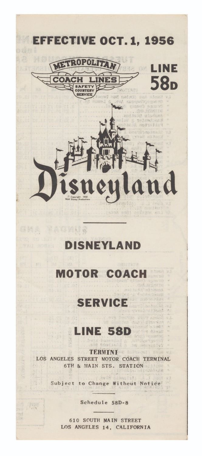 (Disneyland, 1956) A Disneyland Motor Coach Service brochure for Line 58D. The early brochure, effective October 1, 1956, opens to provide bus station and schedule information. Measuring 2.75" x 7" folded, the paper souvenir is in very good condition with light wear and creases.
