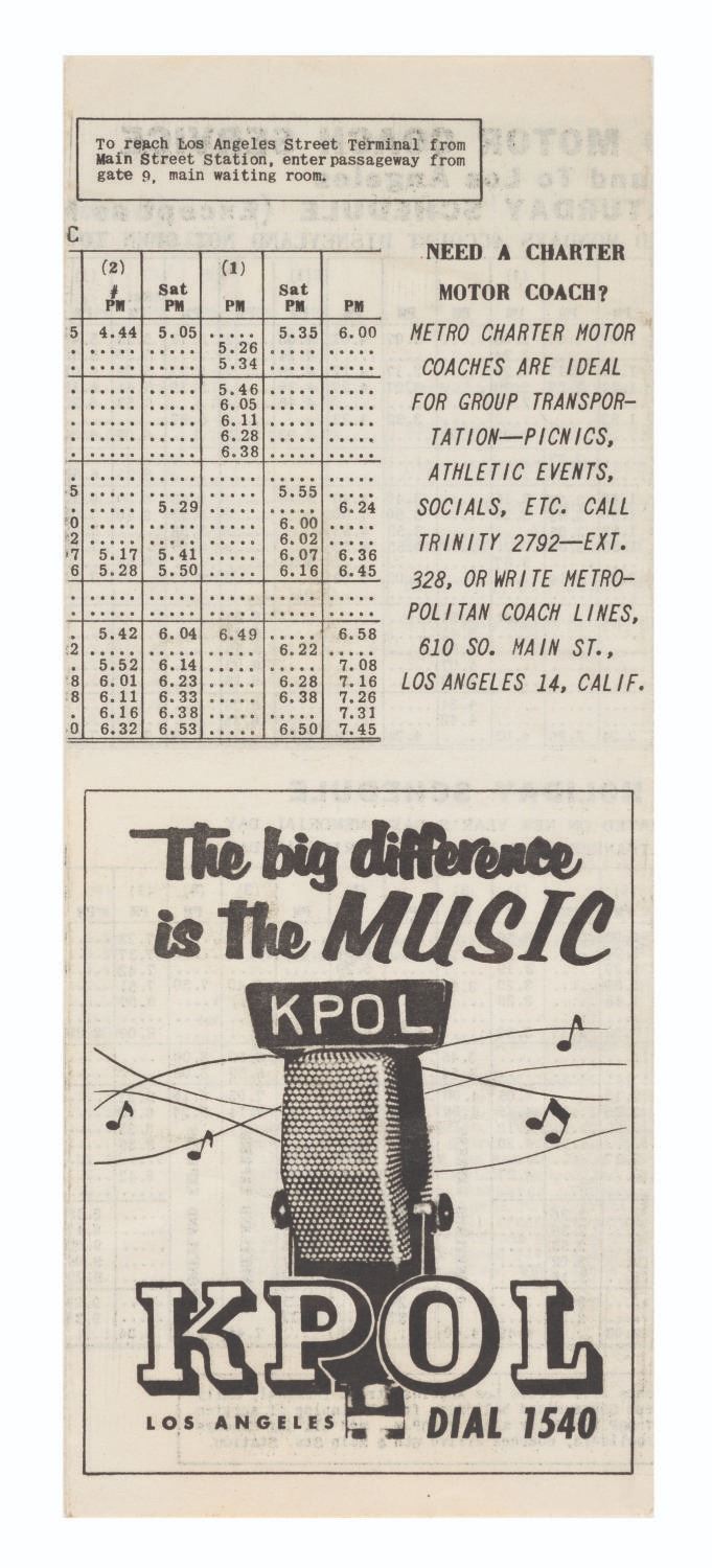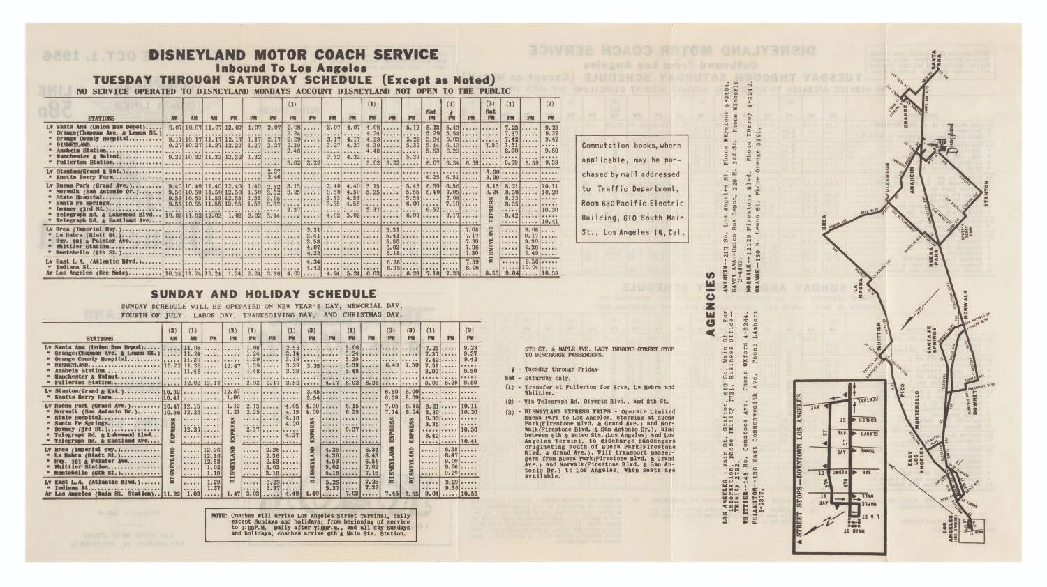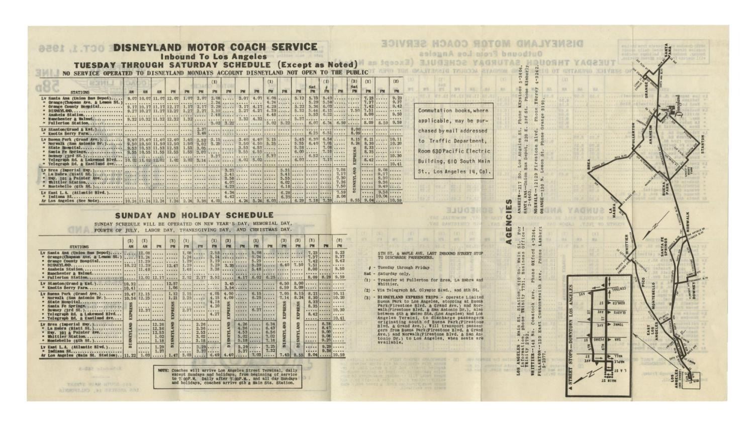 (Disneyland, 1956) A Disneyland Motor Coach Service brochure for Line 58D. The early brochure, effective October 1, 1956, opens to provide bus station and schedule information. Measuring 2.75" x 7" folded, the paper souvenir is in very good condition with light wear and creases.
